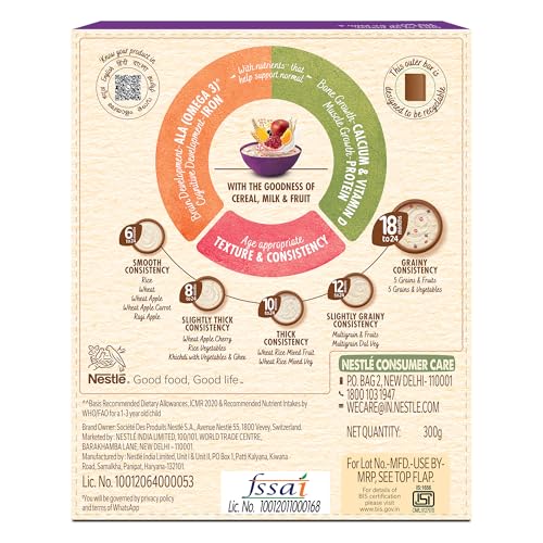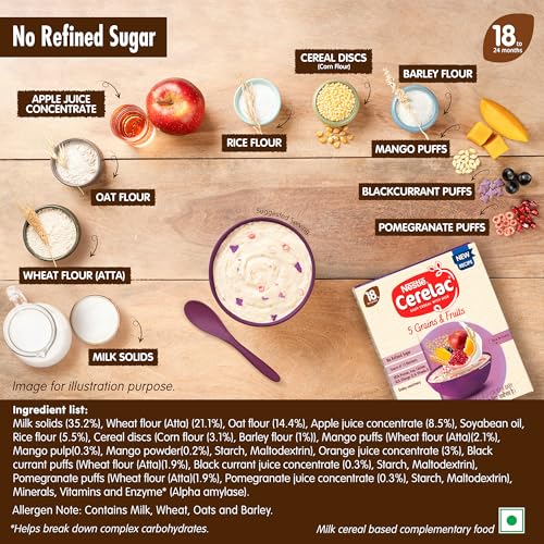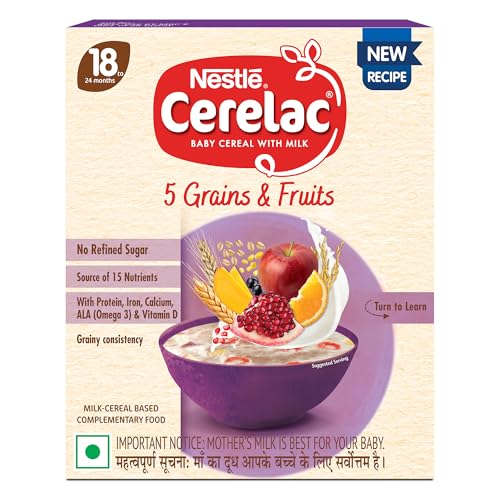 Nestle CERELAC 5 Grains and Fruits with No Refined Sugar is a complementary baby food for infants from 18 to 24 months. It is also a source of 15 important nutrients including vitamins and minerals. With Protein Iron Calcium ALA (Omega 3) & Vitamin D. This baby food cereal is packed with the goodness of cereal milk and fruit. With 155 years of scientific expertise in infant nutrition Nestle develops infant nutrition products backed by evolving science and research. Innovation has been at the heart of Nestle since its beginning. Contains no Refined Sugar. Storage Instructions: Store unopened pack in a cool and dry place. After opening use the contents within 3 weeks or the expiry date whichever is earlier. Prolonged storage and exposure to air may result in infestation & off odors & taste. On opening transfer the contents of the pack along with the pouch into a clean airtight container. After each use close lid tightly and store in a cool dry and hygienic place. Important Notice: Motherâs milk is best for your baby. Warning/Caution : Careful and hygienic preparation of infant food is most essential for health. Do not use fewer scoops than directed since diluted feeding will not provide adequate nutrients needed by your infant. Do not use more scoops than directed since concentrated feed will not provide the water needed by your infant. Infant food shall be only used on the advice of a health worker as to the need for its use and the proper method of its use Safety warning: Infant food is not the sole source of nourishment of an infant. Boiled and cooled water shall be used to prepare this product and any leftover product must be discarded to reduce the risk of infection Use prepared feed within half an hour otherwise microbial deterioration may set in. Discard unused feed. The scoop provided with this pack should be thoroughly washed and dried before use Allergen note: Contains Wheat Milk Oats and Barley.