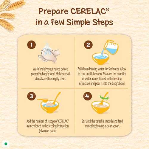 Nestle CERELAC Wheat Apple is a complementary baby food for infants from 6 to 24 months. 2 serves of CERELAC Wheat Apple Cereal provide 37% of a babyâs daily need^ of iron. It is also a source of 14 important nutrients including vitamins and minerals. This baby food cereal is rich in protein and packed with the goodness of cereal milk and fruit. With 155 years of scientific expertise in infant nutrition Nestle develops infant nutrition products backed by evolving science and research. Innovation has been at the heart of Nestle since its beginning. Storage Instructions: After opening the pack the contents should immediately be transferred to an empty clean dry and airtight container. After each use replace lid tightly & store in a cool dry and hygenic place. Important Notice: Motherâs milk is best for your baby. ^Basic Recommended Dietary Allowance ICMR 2020 & Recommended Nutrient Intake by WHO/FAO for a 6-12 month or 1-3 year old child .Ensure enclosed scoop is thoroughly washed and dried before use. After opening use the contents within 3 weeks or the expiry date whichever is earlier. Important Notice:Motherâs milk is best for your baby. Safety Warnings: Infant food should be used only on the advice of a health worker as to the need for its use and the proper method of its use. Infant food is not the sole source of nourishment for an infant. Use prepared feed within half an hour otherwise microbial deterioration may set in. Discard unused feed.