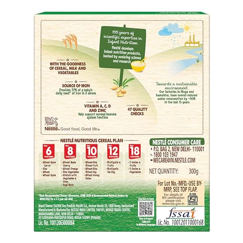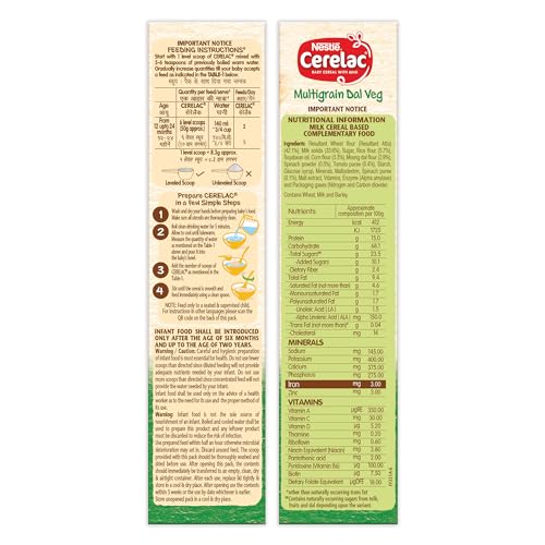 Nestle Cerelac Baby Cereal with Milk is a complementary baby food for infants from 12 to 24 months. While infants and children have higher requirements of nutrients than adults 2 serves of Cerelac Multigrain Dal Veg Cereal provide 37% of a babydaily needof iron. It is also a source of 14 important nutrients including vitamins and minerals. Vitamin A C D and Zinc help support normal immune system function. This baby cereal is rich in protein and packed with the goodness of cereal milk and vegetables. With 155 years of scientific expertise in infant nutrition Nestle develops infant nutrition products backed by evolving science and research. Innovation has been at the heart of Nestle since its beginning. Usage: Step 1: Wash and dry your hands before preparing baby's food. Make sure all utensils are throughly clean. Step 2: Boil clean drinking water for 5 minutes. Allow to cool until lukewarm. Measure the quantity of water as mentioned on the table-1 above and pour it into the babybowl. Step 3: Add the number of scoops of CERELAC as mentioned in the table 1. Step 4: Stir until the cereal is smooth and feed immediately using a clean spoon. Warning: Infant food should be used only on advice of a health worker as to the need for its use. Discard unused feed. Infant food is not the sole source of nourishment. Storage Instructions - After opening the pack the contents should immediately be transferred to an empty clean dry and airtight container. After each use replace lid tightly & store in a cool dry and hygenic place.