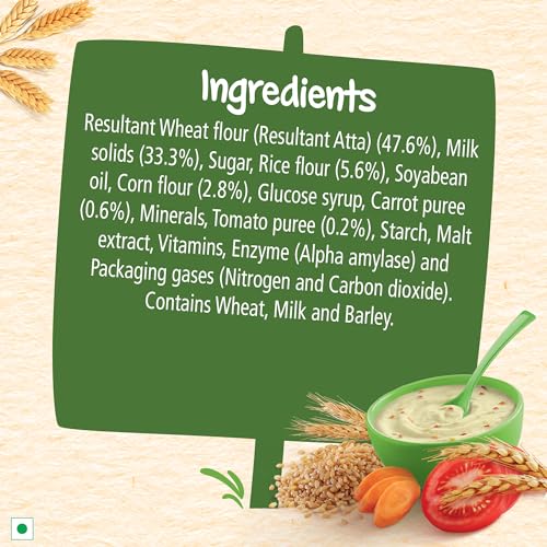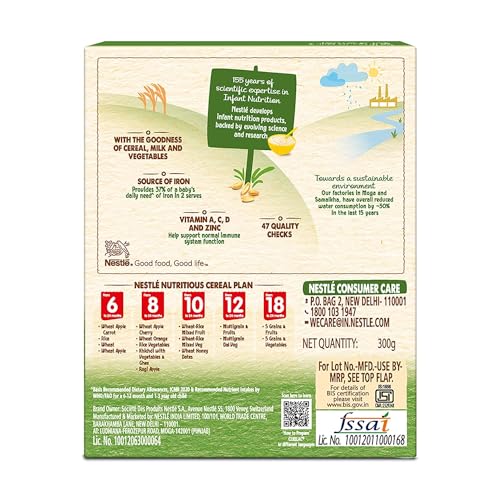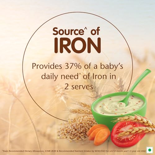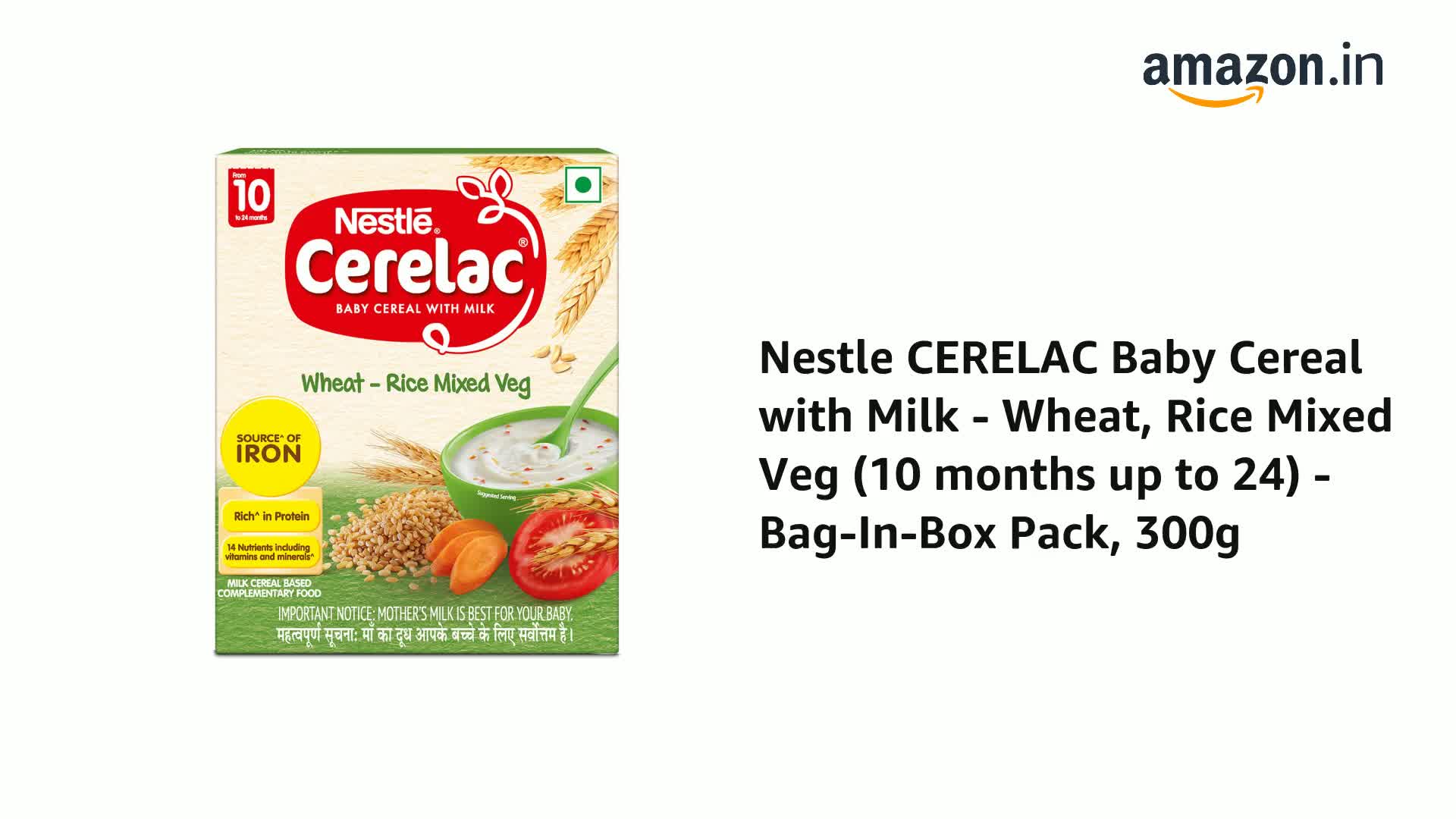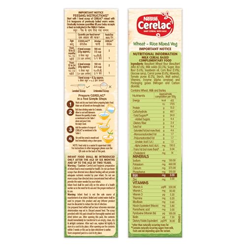Product Description Nestle Cerelac Baby Cereal with Milk is a complementary baby food for infants from 10 to 24 months. While infants and children have higher requirements of nutrients than adults 2 serves of Cerelac Wheat - Rice Mixed Veg Cereal provide 37% of a babydaily needof iron. It is also a source of 14 important nutrients including vitamins and minerals. Vitamin A C D and Zinc help support normal immune system function. This baby cereal is rich in protein and packed with the goodness of cereal milk and vegetables. With 155 years of scientific expertise in infant nutrition Nestle develops infant nutrition products backed by evolving science and research. Innovation has been at the heart of Nestle since its beginning. Storage Instructions: After opening the pack the contents should immediately be transferred to an empty clean dry and airtight container. After each use replace lid tightly & store in a cool dry and hygenic place. Important Notice: Mothermilk is best for your baby. Basic Recommended Dietary Allowance ICMR 2020 & Recommended Nutrient Intake by WHO/FAO for a 6-12 month and 1-3 year old child.Safety Warnings: Infant food should be used only on the advice of a health worker as to the need for its use and the proper method of its use. Infant food is not the sole source of nourishment for an infant. Use prepared feed within half an hour otherwise microbial deterioration may set in. Discard unused feed. From the Manufacturer IngredientsWheat flour Milk solids Sucrose Soyabean oil Rice flour Corn crunchies Spinach crunchies Carrot crunchies Green pea crunchies Tomato crunchies Minerals and Vitamins Storage InstructionsAfter opening this pack the content should immediately be transferred to an empty clean dry & airtight container. After each use replace lid tightly & store in a cool & dry place. Directions Wash your hands. Use clean utensils Boil drinking water for 5 minutes. Leave it till lukewarm Pour 100 ml of lukewarm water into a bowl Add 4 level scoops of CERELAC Stir until pap is smooth. Feed your baby with a clean spoonSafety WarningsCareful and hygienic preparation of infant food is most essential for health. Do not use fewer scoops than directed since diluted feeding will not provide adequate nutrition needed by your infant. Do not use more scoops than directed since concentrated feed will not provide the water needed by your infant. Infant food should be used only on the advice of a health worker as to the need for its use and the proper method of its use. The world health organization recommends exclusive breastfeeding for 6 months. Nestle supports this recommendation. Since babies vary in their needs consult your healthcare professional for advice on when to introduce CERELAC to your child. Breastfeeding should continue for as long as possible after introduction of weaning foods. Indications/Suggested UsageComplementary food for babies after 6 months when breast milk alone can no longer totally cover the baby's growing nutritional requirements