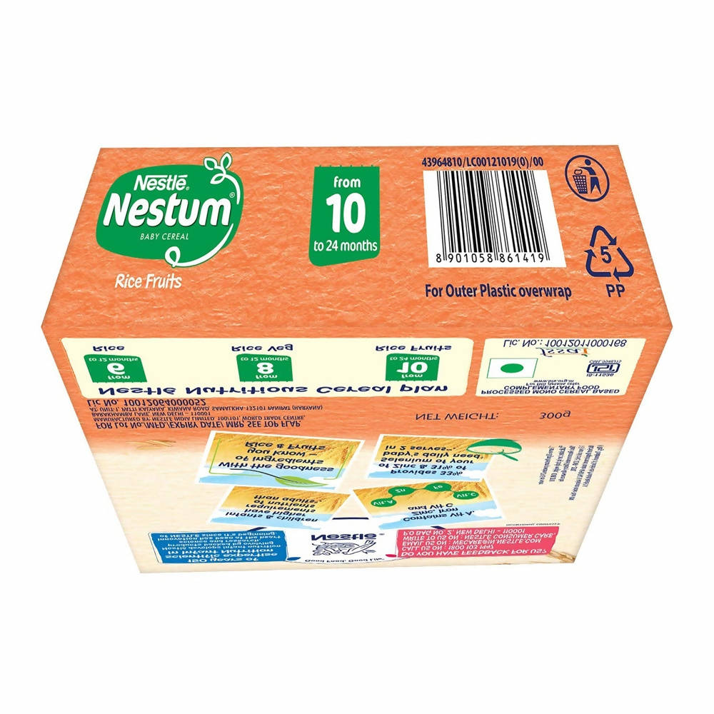 Nestle Nestum Baby Cereal-Rice Fruits From 10 to 24 months: 300 gmIngredients:Rice flour, Apple juice concentrate, Rice crisp, Cherry crunchies, Minerals, Orange juice concentrate, and VitaminsDirections:Boil milk. Allow it to cool downPour milk into baby's bowl and add NestumStir until the pap is smooth. Feed your baby with a clean spoon.Also, Ingredients like fruit juices and mashed fruit, cooked and pureed spinach, boiled and mashed dals, cooked and mashed vegetables and curds, can be added to already prepared NESTUM, to make nutritious feeds for the babies.Safety Warnings:Careful and hygienic preparation of infant food is most essential for health. Do not use fewer scoops than directed, since diluted feeding will not provide adequate nutrition needed by your infant. Do not use more scoops than directed, since concentrated feed will not provide the water needed by your infant. Infant food should be used only on the advice of a health worker as to the need for its use and the proper method of its use. The world health organization recommends exclusive breastfeeding for 6 months. Nestlé supports this recommendation. Since babies vary in their needs, consult your healthcare professional for advice on when to introduce caerelac to your child. Breastfeeding should continue for as long as possible after the introduction of weaning foods.Legal Disclaimer: The product is guaranteed to be 100% genuine. Product images are