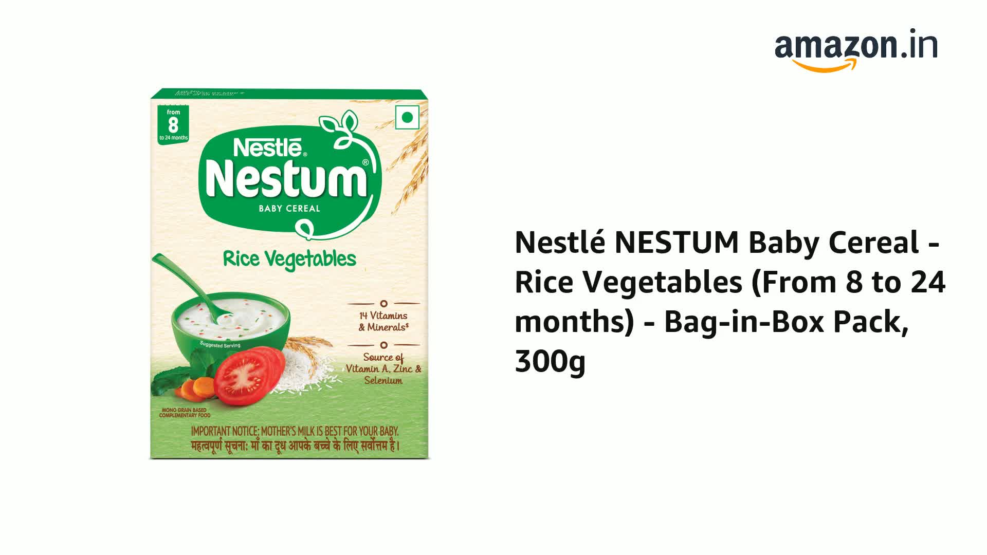 Nestle NESTUM (Rice Vegetables) Baby Cereal is a processed mono grain based complimentary food for infants from 8 months up to 24 months. . This baby growth food is a source of 14 nutrients including vitamins and minerals and contains Vitamin A Zinc Iron Selenium and Vitamin C. Nestle NESTUM is free from preservatives added colours and flavours.Nestle develops infant nutrition products backed by evolving science and research. Innovation has been at the heart of Nestle since its beginning. Optimal Preparation: Careful and hygienic preparation of Infant food is most essential for health. Do not use fewer scoops than directed since diluted feeding will not provide adequate nutrients needed by your infant. Do not use more scoops than directed since concentrated feed will not provide the water needed by your infant. Storage: After opening the pack the contents should immediately be transferred to an empty clean and dry airtight container. Replace the lid tightly after every use and store in a cool dry place. Ensure enclosed scoop is thoroughly washed and dried before use. After opening use the contents within 3 weeks or the expiry date whichever is earlier. Important Notice: Mothermilk is best for your baby. Safety Warnings: This is Processed Mono Cereal based Complimentary food for use in specific conditions under medical guidance only. Infant food shall be introduced only (after the age of 6 months up to the age of two years). Infant food should be used only on the advice of a health worker as to the need for its use and the proper method of its use. Infant food is not the sole source of nourishment for an infant. Use prepared feed within half an hour otherwise microbial deterioration may set in. Discard unused feed.