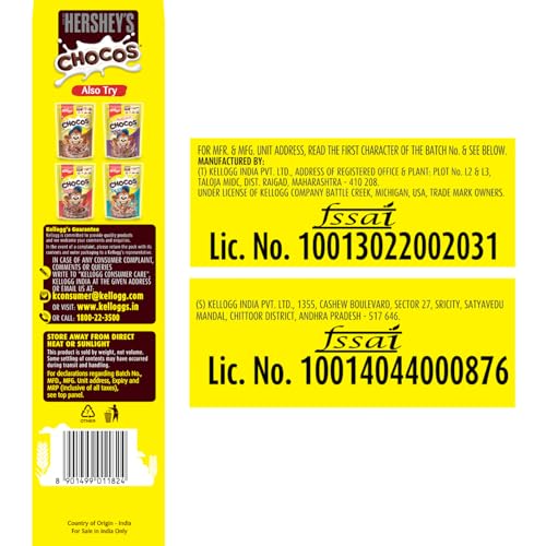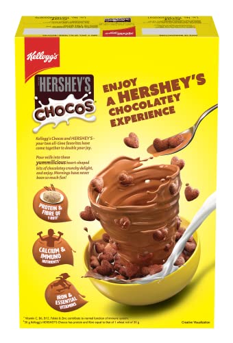 • +One serve (30g) of Kellogg's HERSHEY'S Chocos gives the Power of 5 by providing Protein & Fibre of 1 roti* Calcium Iron Immuno nutrients** and Essential Vitamins.