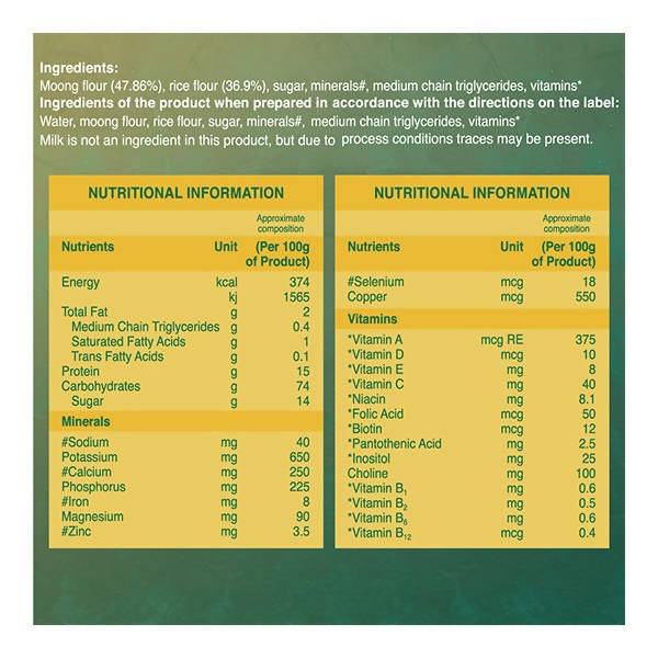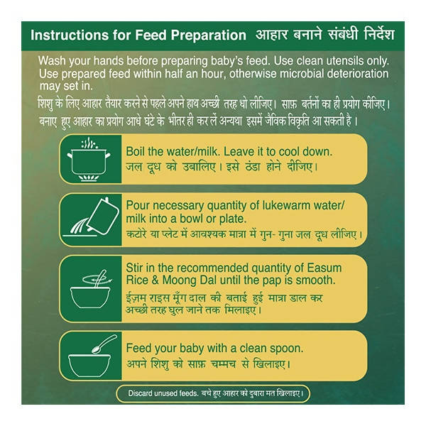 Nutricia Easum Baby Cereal 400 gm:Key Ingredients:RiceMoong dalSugarMedium-chain triglyceridesVitaminsCarbohydratesMineralsAmino acidsKey Benefits:Easum Rice and Moong dal are simple to digest first solid food for babies. Its a complementary food for infants and shall be introduced only after 6 months and up to the age of 2 yearsEasum contains essential nutrients like protein, carbohydrate, medium-chain triglycerides, vitamins, minerals, and amino acids to provide nutrition to babiesEasum baby cereal is made from quality rice and moong dal flour, pre-cooked and enhanced nutritionally to suit your babys tenderIt can be mixed with soups, vegetables, eggs, and fruits to make a nutritious and tasty solid food for babiesDeveloped by Nutricia, Easum is a complementary food for infants after 6 months and up to the age of 2 years. At Nutricia, they ensure proper research and science-based solutions to provide the optimal nutrition for infants and young childrenImportant Notice: Mothers milk is best for your babyDirections For Use:Use as directed on the label.Legal Disclaimer: The product is guaranteed to be 100% genuine. Product images are for illustrative purposes only. Images/packagi