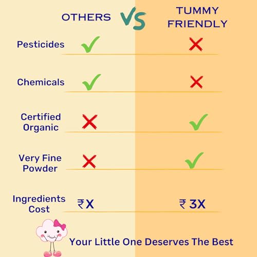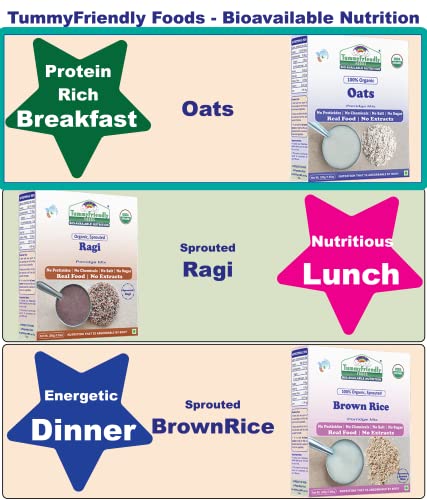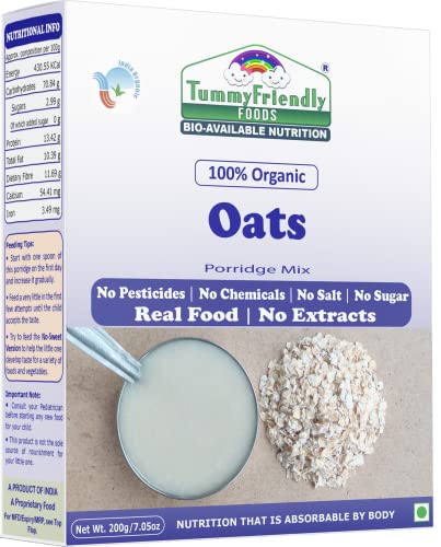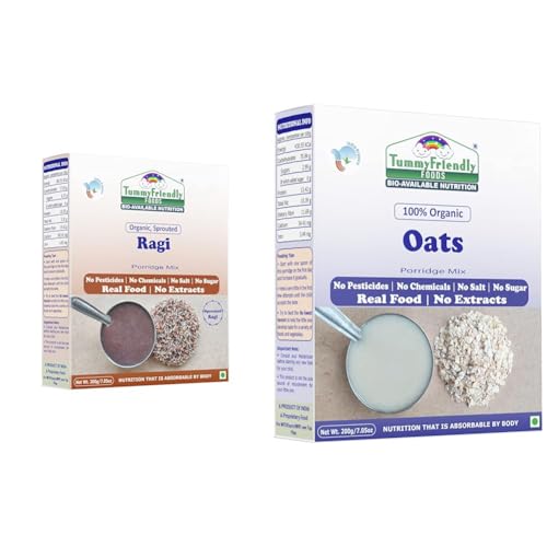 TummyFriendly Foods Certified Organic Sprouted Ragi Flour For Little Ones. Made of Organic Sprouted Ragi Powder | Ragi Flour for Baby rich in Calcium Iron Fibre & Micro-Nutrients. Ragi Sari Nachani Satva. No Sugar No Salt No Milk No Chemicals No Pesticides | Maximum Nutrition From Real Food. Available in Trial Baby Packs too. Shelf Life 6 Month | 200g ONE PACKExcellent source of Calcium and Iron Good source of Protein Vitamins and Minerals Rich in Dietary-Fibre for a Happy-TummyTummyFriendly Foods Certified Organic Oats Porridge Mix | India-Organic Certified Organic Oats for Baby 6 Months | No Sugar No Salt No Milk No Chemicals No Pesticides & No GMO | Rich in Protein Beta Glucon Healthy Fat and Dietary Fiber | Maximum Possible Nutrition From Real Food | Available in Trial Baby Packs too | Shelf-life 9 Months | 200gCertified Organic NO CHEMICAL FORTIFICATION No Sugar No Salt No Pesticides & No GMO Oats are famous for Beta-Glucan a soluble fibre which promotes heart health and healthy gut bacteria. Oats are known to have high levels of Manganese an essential mineral for bone health and nutrient metabolism. Oats are an excellent source of molybdenum an essential mineral which activates enzymes that help break down harmful sulfites and prevent toxins from building up in the body. Oats are also a very good source of phosphorus as well as a good source of copper biotin vitamin B1 magnesium dietary fiber chromium and zinc. Oats are a good source of Protein and Iron Oats are loaded with Carbohydrates Protein Health-Fat and Dietary Fiber. Oats are one of the healthiest ways to make your little one gain weight TummyFriendly Foods: BIS Certified Organic Baby Food Company. Maximum Possible Bio-available Nutrition from Real Food; available in 200 g packs and 50 g baby packs for trial. No extracts no unhealthy ingredients Freshly-made in Small Batches. Can be cooked under 5 min. Oats is one of first foods given to little ones throughout the world. Easy to digest.