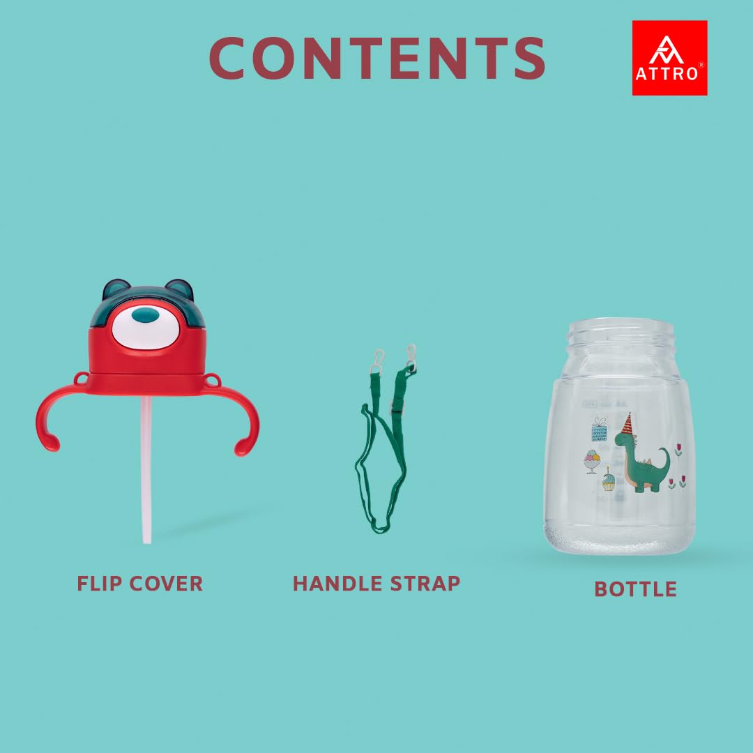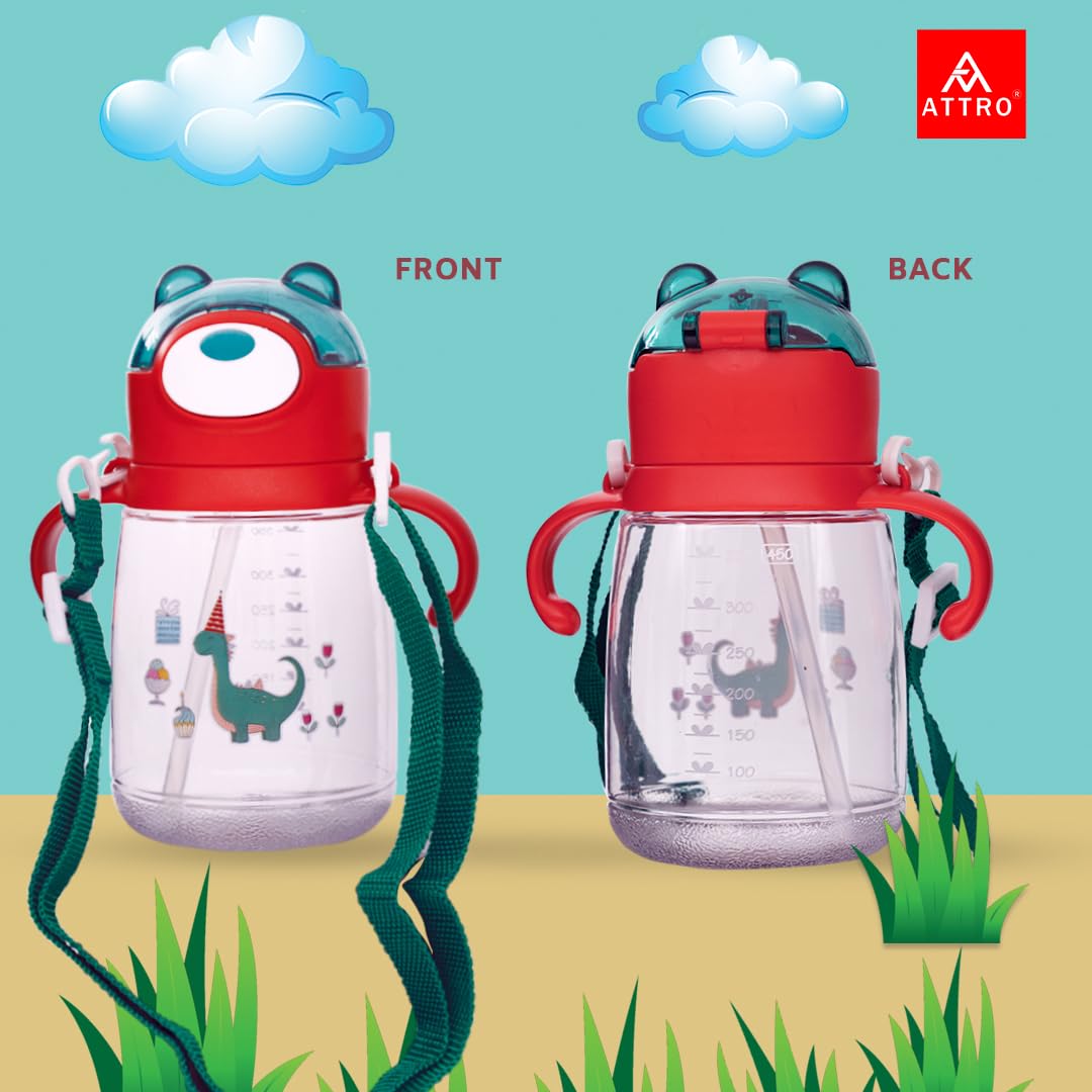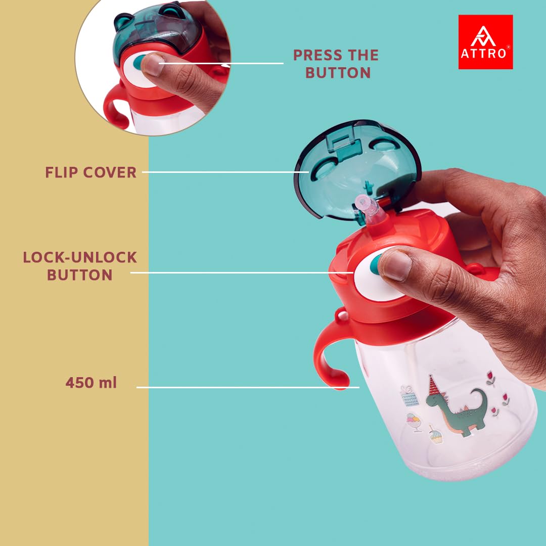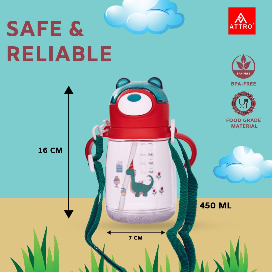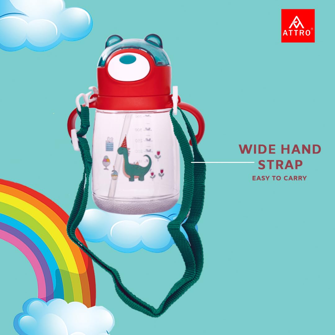 Attro Jolly 450ml Cute and Convenient Cartoon Printed Toddlers Learn Tranning Plastic Bottle with Two Side Handles & Straw Lid BPA-FreeLeak-ProofEasy to Clean-Perfect for SchoolOutdoorRed