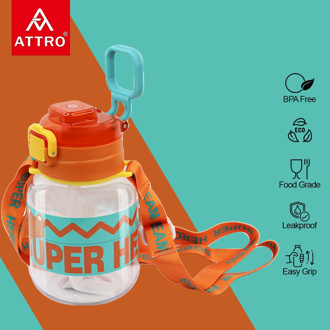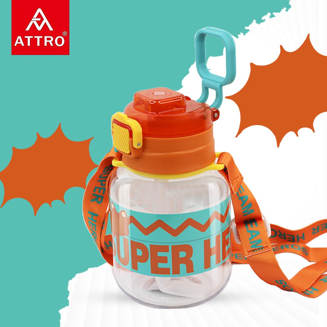 Attro Spike Kids 670ml Water Bottle with Straw Lid & Nylon Strap BPA Free Leak Proof Ideal for Toddlers - Orange