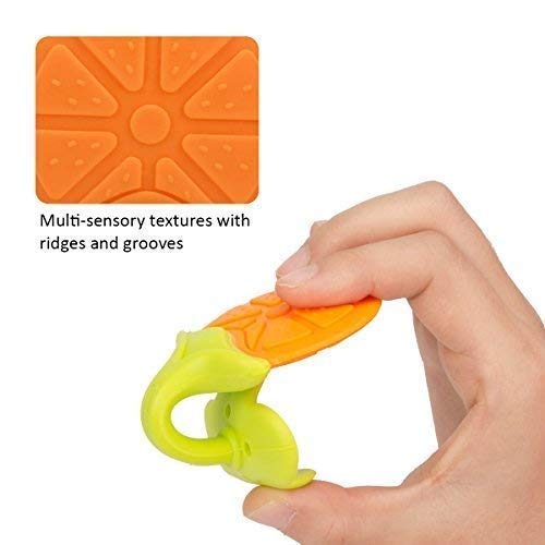 3. SOFT SILICONE MATERIAL âOur teether toys are made of soft and smooth silicone materialit is best for sore gums pain relief. It have the grooves and bumps to gently rub a baby's gums without harming the child's mouth area. And the soft infant teething