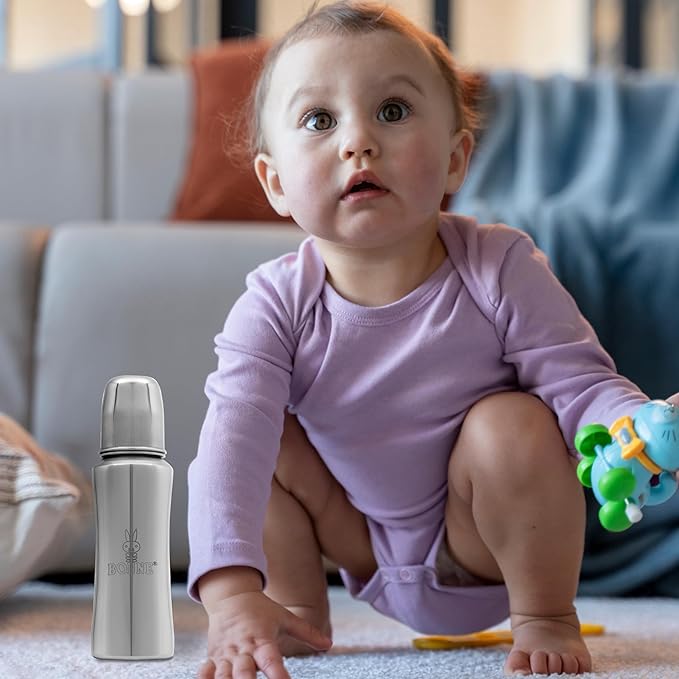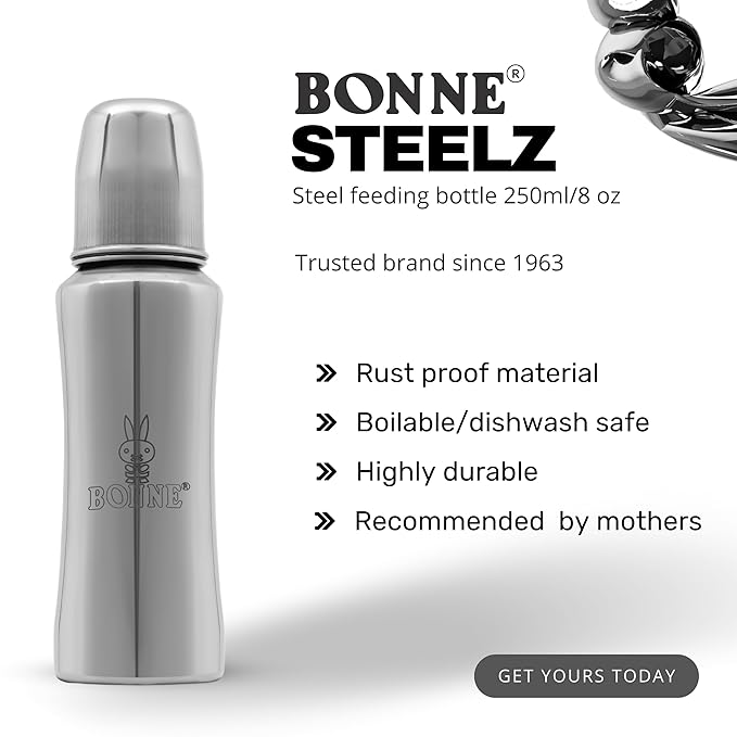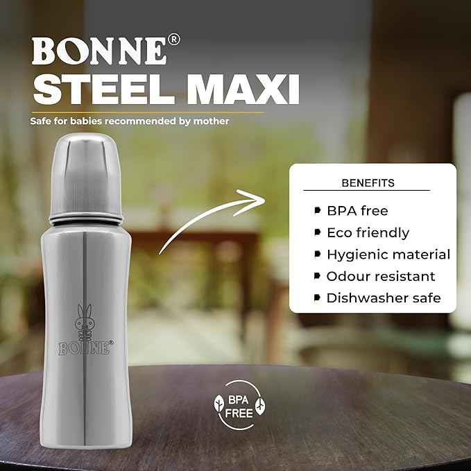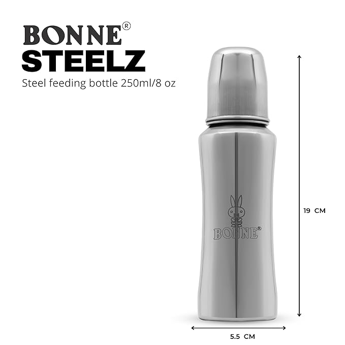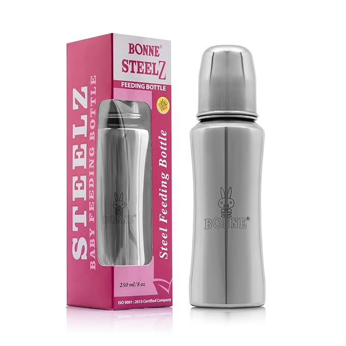 • PREMIUM STAINLESS STEEL BABY FEEDING BOTTLE – SAFE, DURABLE & LEAK-PROOF The BONNE 250ml Stainless Steel Baby Bottle is designed for newborns, infants, and toddlers (0-3 years), ensuring a safe and hygienic feeding experience. Made from high-quality, rust