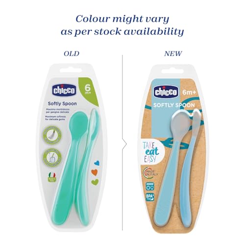 Chicco Baby Self Feeding Spoon with Soft Tip, Suitable For Training Toddlers, Soft & Flexible Silicone, Blue, 6m+ (Pack of 2)