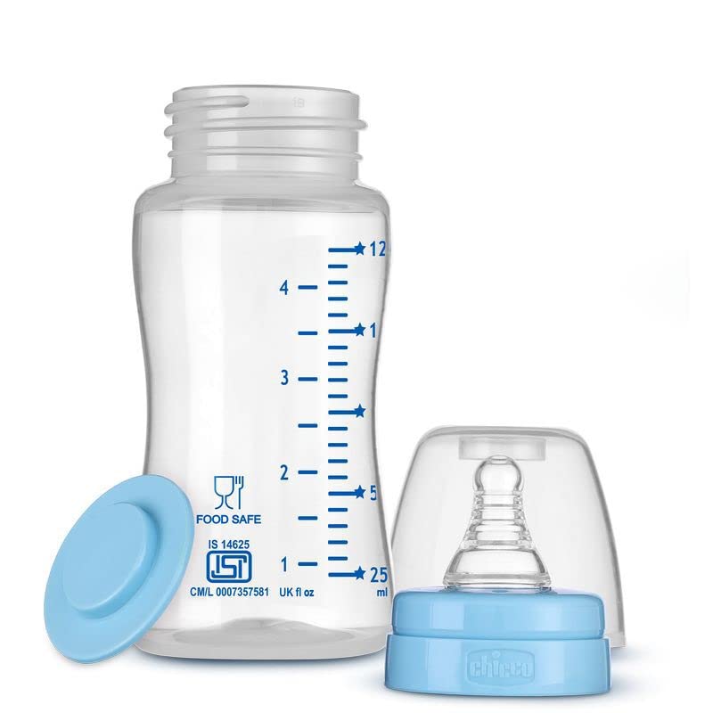 Chicco always places the care and well-being of babies and parents at the forefront. Therefore Chicco brings you Chicco feed easy Baby Feeding Bottle designed in collaboration with Chicco Research Centre. Chicco feed easy Feeding Bottle is designed to provide an easier and more comfortable feeding experience for babies. Chicco feed easy Bottle has an advanced anti-colic system. It has an anti-colic valve situated at the base of the teat (nipple) that helps reduce air ingestion by the baby while feeding thereby reducing colic gas & discomfort. The valve also promotes continuous milk flow and uninterrupted feeding. The unique spiral-grooved nipple texture helps to reduce air bubbles as milk passes through it resulting in air-free feeding and no nipple collapse. Further the teat (nipple) of the bottle is made of high-quality soft silicone material that ensures an easy and comfortable latch. The nipple is designed to give a mother-like feeling to the baby ensuring an easy transition between bottle and breastfeeding and vice versa. Furthermore Chicco feed easy Milk Feeding Bottle is made with high-quality BPA-free material to provide hygiene at its best. The Chicco baby feeding bottle is easy to carry has easy to read scale is easy to fill & clean offers an easy grip and is easy to sterilize. Chicco milk bottle for babies is also food and microwave-safe and is quite practical & handy as it comes with a spill-proof cap and additional stopper. Chicco feed easy Bottle is not just easy for the baby but for you as well!