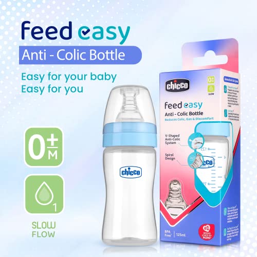 Chicco feed easy Milk Feeding Bottle for Babies & Toddlers, V-Shaped Anti-Colic System to Prevent Colic, Gas & Discomfort, For Comfortable latch, Ultra-Soft Silicone Nipple, Spill-Proof Cap & Stopper, BPA-free, Slow Flow, 0m+ (Pink, 125 ml Bottle, Blue)