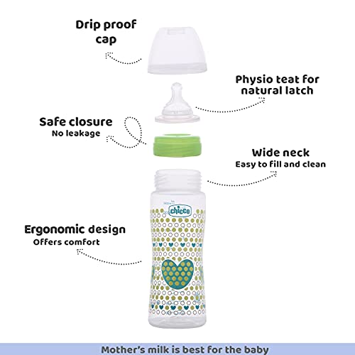 Chicco Well-Being Feeding bottles are especially designed to provide the baby with a comfortable and relaxed feeding experience. To give baby the natural feeding experience Well-Being feeding bottle comes with an advanced teat i.e. Physio teat whose shape has been inspired from the shape of the motherâs nipple to promote the babyâs natural sucking movement. The anti-colic valve situated at the base of the teat helps to prevent the ingestion of air and promotes a constant flow of milk thus reducing the risk of colic regurgitation hiccups or any discomfort to the baby. The symmetrical elongated and flattened shape of the Physio teat that mimics the motherâs nipple fits perfectly to the babyâs mouth and promotes the physiological movement of babyâs tongue. Making it more preferable for babies the soft and hygienic silicone teat gives a soothing and pleasant feel to the baby helping in easy transition between breastfeeding and bottle feeding and vice-versa. The ergonomic shape of the bottle is easy to hold and grip even by babyâs little hands. Chicco Well Being Bottle is made with high-quality BPA-free polypropylene material that ensures maximum protection and hygiene. For parentâs ease the bottle has a wide neck design which provides easy and quick filling and is effortless to wash. Drip poof cap and bottle gear ensure safe closure and no leakage from the bottle. Easy to clean the Chicco Well-Being baby bottles are available in beautiful colours & decorations and are ideal for babyâs everyday feeding routine.
