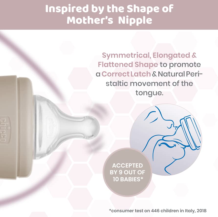 Made of Premium quality borosilicate glass. It is 100% Food-Grade material which is BPA free and ensures that there is no leaching of toxic elements in milk thus providing the baby a pure hygienic and comfortable feeding experience.