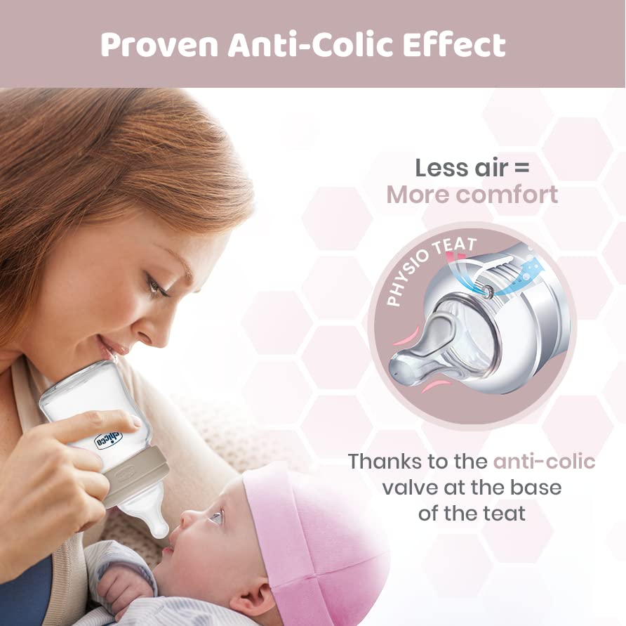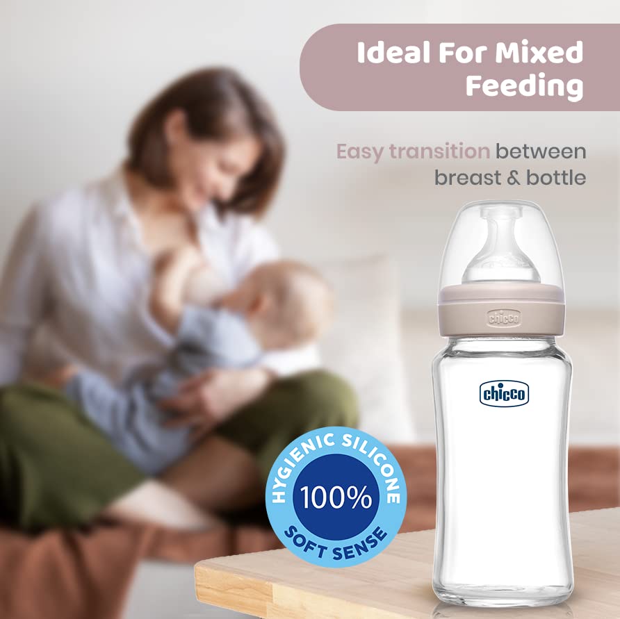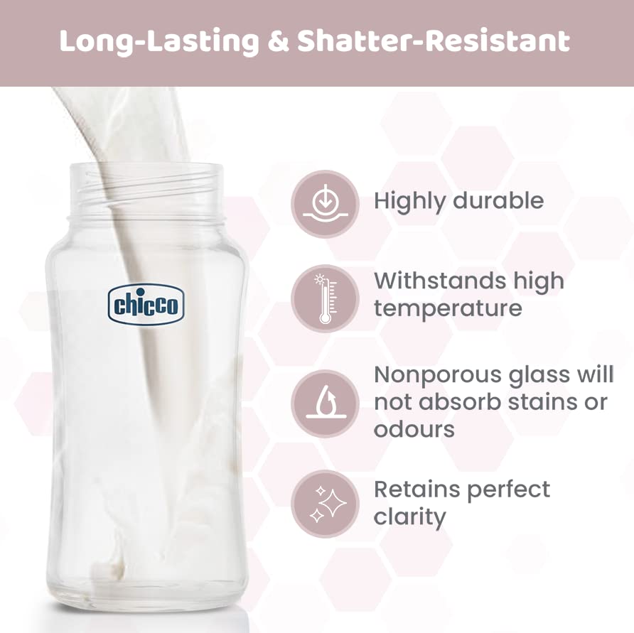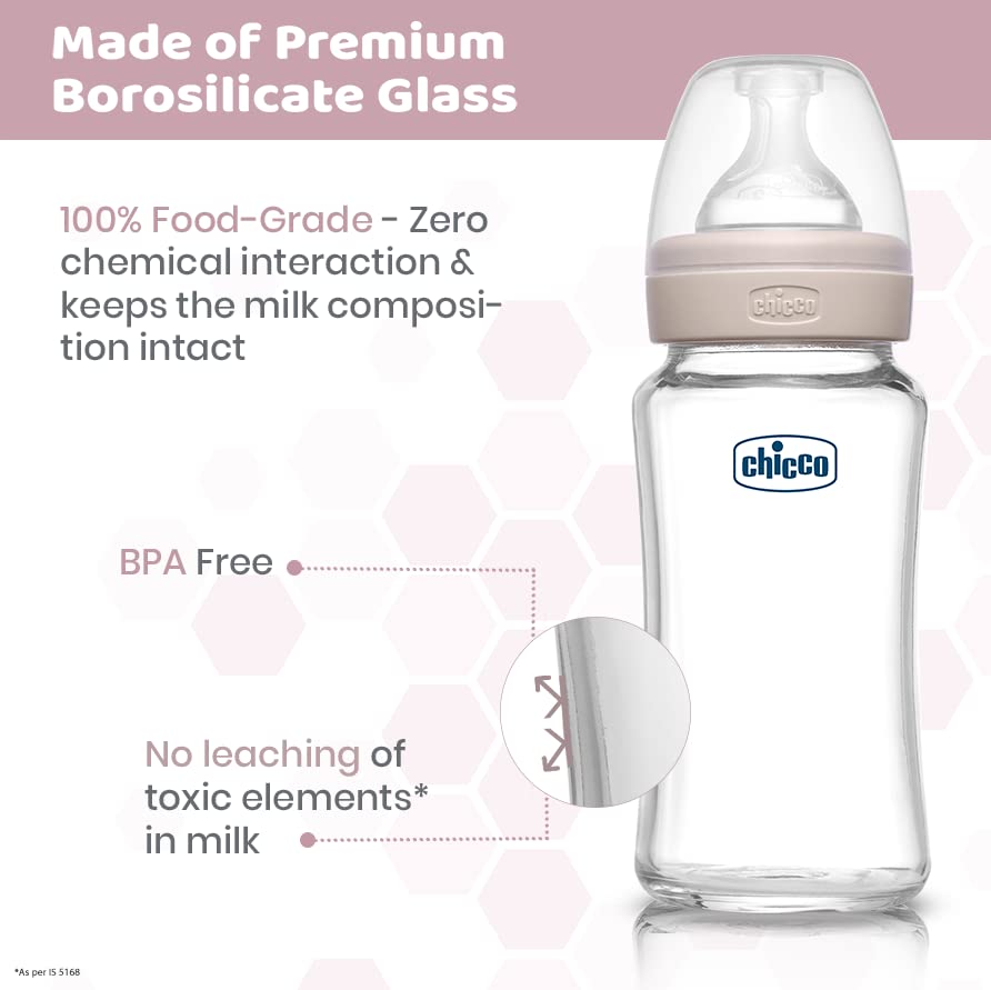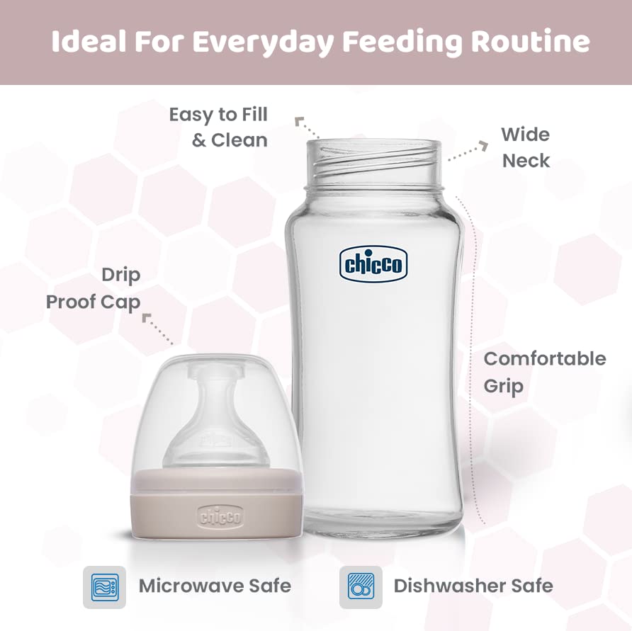 HomeBabyFeedingFeeding AccessoriesChicco Well-Being Glass Feeding Bottle for Babies (240ml Medium Flow) | Premium Borosilicate Glass for High Durability | Elongated Teat for Correct Latch | Comes with Anti-Spill Cap | BPA Free