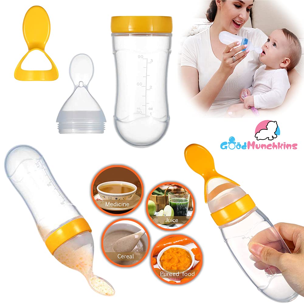GOODMUNCHKINS Stainless Steel Baby Feeding Bottle - Silicon Food Feeder Silicone Spoon Feeder makes baby feeding easy for Parents. Ideal for 6 months and up babies this all-in-one feeder makes it a lot quicker and easier to feed a fussy baby. The Baby Feeder spoon and bottle are made of food-grade silicone Soft enough to touch babies' mouth. Clean the Silicone Spoon Feeder before use all parts can be sterilized or boiled in water for 3 to 5 minutes. A convenient way to feed your baby first pureed foods and cereals and help make feeding time more easier and less messy. Gently squeeze the Spoon Feeding Bottle until the desired amount of food collects onto the spoon to feed the baby.