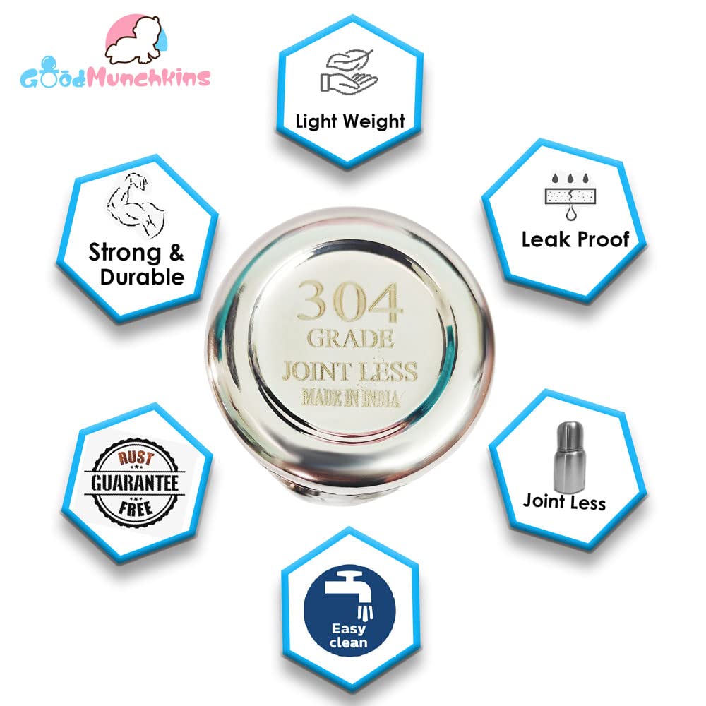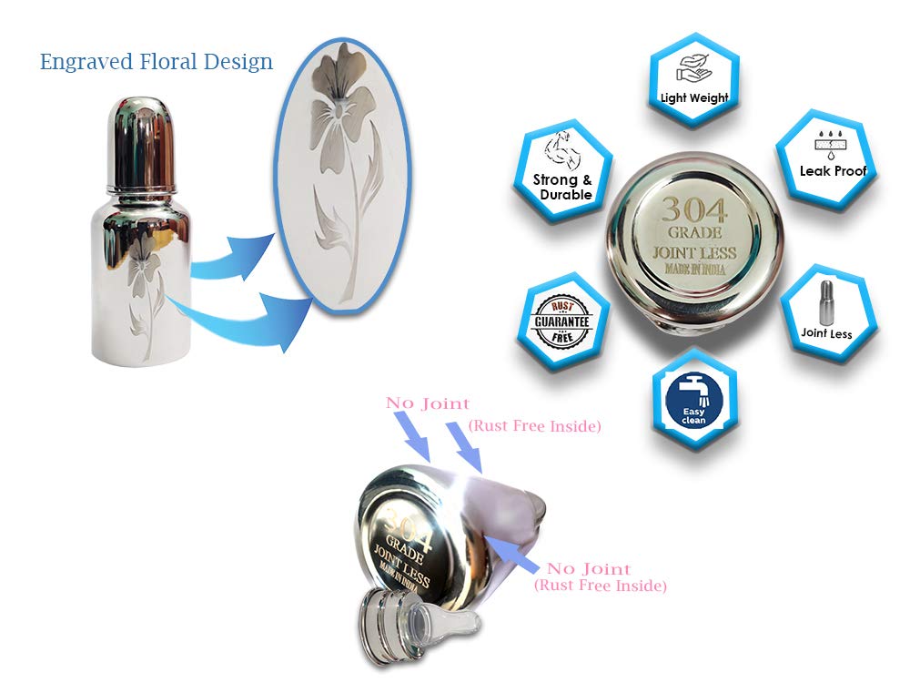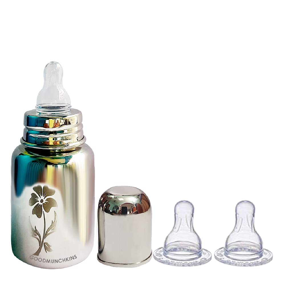 Goodmunchkins Stainless Steel Feeding Bottles opt for Newborn Baby/Infants/Toddlers. The size available 75150300ml Capacity. The Bottle is made of 304 Grade Steel without any welding Joints in the Bottle hence there is Rust Free Insides and Outside of the Bottle considering the Hygiene and Health of your Baby. The Bottle is made 100% with No Leakage on the neck side There are more quality checks Before Dispatching the Bottle to the Customer. Mirror finishing Bottle we can store Milk/Water/Juice/Soup. Lightweight so baby can hold it easily at the same time it very strong product. The Nipple is made of Food Grade Silicone. Extra soft medical-grade silicone spout provides an easy transition from bottle-feeding. Smooth Design with no sharp curves or edges keeping in mind Easy and Safe cleaning of the bottle. Easy to Carry Easy to Handle and Easy to Clean. No smell. No mess. The bottle is of sleek design and is very convenient while handling. Reduces sterilization work. Only Silicon Nipple needs to be sterilized. The bottle can be washed with Soap and Water Made in India.