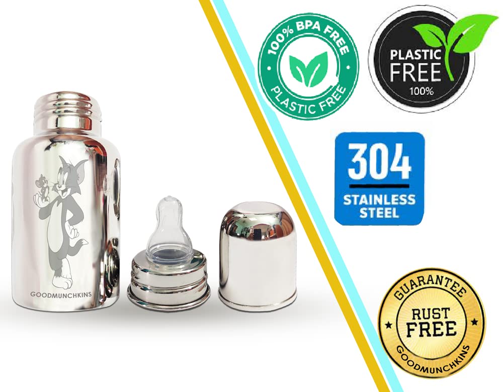 Goodmunchkins Stainless Steel Feeding Bottles opt for Newborn Baby/Infants/Toddlers. The size available 75150220280300ml Capacity. The Bottle is made of 304 Grade Steel without any welding Joints in the Bottle hence there is Rust Free Insides and Outside of the the Bottle considering Hygiene and Health of your Baby. The Bottle is made 100% No Leakage in the neck side There is more quality checks Before Dispatch the Bottle to the Customer. Mirror finishing Bottle we can store Milk/Water/Juice/Soup. Lightweight so baby can hold easily at the same time it very strong product. The Nipple is made of Food Grade Silicone. Extra soft medical-grade silicone spout provides an easy transition from bottle-feeding. Smooth Design with no sharp curves or edges keeping in mind Easy and Safe cleaning of the bottle. Easy to Carry Easy to Handle and Easy to Clean. No smell. No mess. The bottle is of sleek design and is very convenient while handling. Reduces sterilization work. Only Silicon Nipple needs to be sterilized. The bottle can be washed with Soap and Water Made in India.