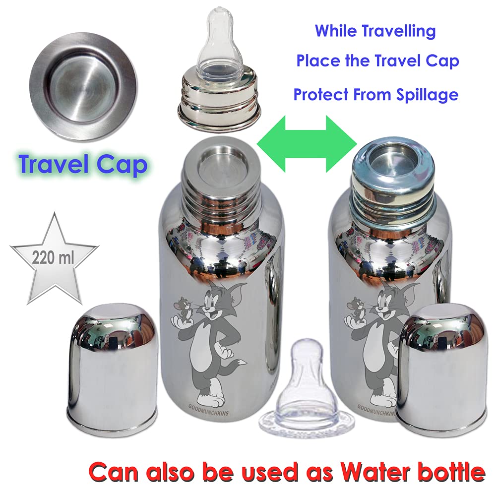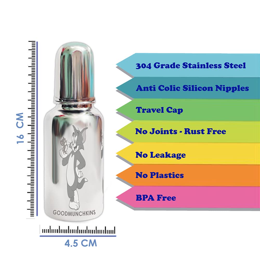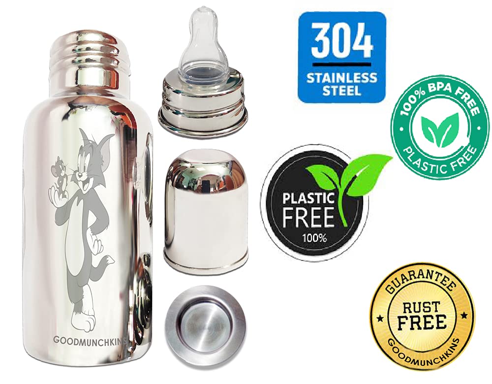 Goodmunchkins Stainless Steel Feeding Bottles opt for Newborn Baby/Infants/Toddlers. The size available 75150220280300ml Capacity. The Bottle is made of 304 Grade Steel without any welding Joints in the Bottle hence there is Rust Free Insides and Outside of the the Bottle considering Hygiene and Health of your Baby. The Bottle is made 100% No Leakage in the neck side There is more quality checks Before Dispatch the Bottle to the Customer. Mirror finishing Bottle we can store Milk/Water/Juice/Soup. Lightweight so baby can hold easily at the same time it very strong product. The Nipple is made of Food Grade Silicone. Extra soft medical-grade silicone spout provides an easy transition from bottle-feeding. Smooth Design with no sharp curves or edges keeping in mind Easy and Safe cleaning of the bottle. Easy to Carry Easy to Handle and Easy to Clean. No smell. No mess. The bottle is of sleek design and is very convenient while handling. Reduces sterilization work. Only Silicon Nipple needs to be sterilized. The bottle can be washed with Soap and Water Made in India.