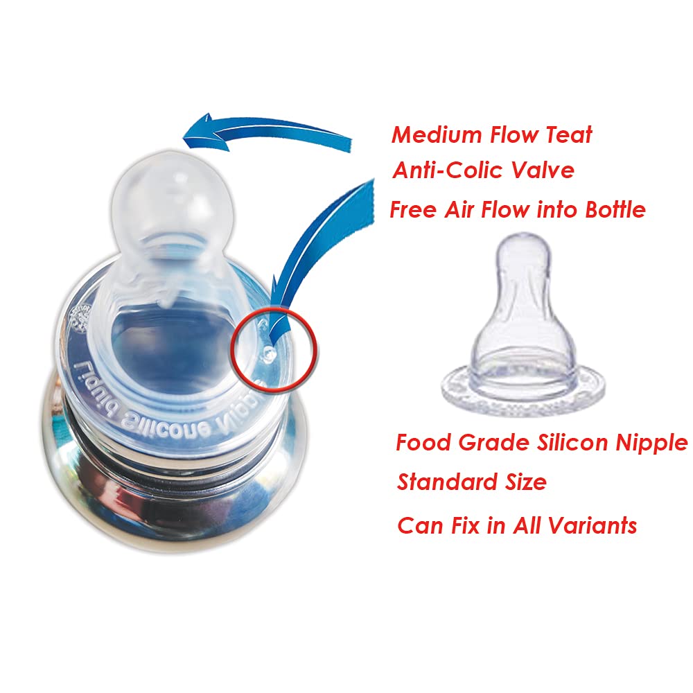Goodmunchkins Stainless Steel Feeding Bottles opt for Newborn Baby/Infants/Toddlers. The size available 75150220280300ml Capacity. The Bottle is made of 304 Grade Steel without any welding Joints in the Bottle hence there is Rust Free Insides and Outside of the the Bottle considering Hygiene and Health of your Baby. The Bottle is made 100% No Leakage in the neck side There is more quality checks Before Dispatch the Bottle to the Customer. Mirror finishing Bottle we can store Milk/Water/Juice/Soup. Lightweight so baby can hold easily at the same time it very strong product. The Nipple is made of Food Grade Silicone. Extra soft medical-grade silicone spout provides an easy transition from bottle-feeding. Smooth Design with no sharp curves or edges keeping in mind Easy and Safe cleaning of the bottle. Easy to Carry Easy to Handle and Easy to Clean. No smell. No mess. The bottle is of sleek design and is very convenient while handling. Reduces sterilization work. Only Silicon Nipple needs to be sterilized. The bottle can be washed with Soap and Water Made in India.