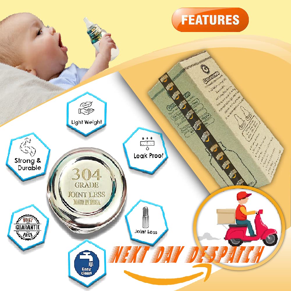Goodmunchkins Stainless Steel Feeding Bottles opt for Newborn Baby/Infants/Toddlers. The size available 75150300ml Capacity. The Bottle is made of 304 Grade Steel without any welding Joints in the Bottle hence there is Rust Free Insides and Outside of the Bottle considering the Hygiene and Health of your Baby. The Bottle is made 100% with No Leakage on the neck side There are more quality checks Before Dispatching the Bottle to the Customer. Mirror finishing Bottle we can store Milk/Water/Juice/Soup. Lightweight so baby can hold it easily at the same time it very strong product. The Nipple is made of Food Grade Silicone. Extra soft medical-grade silicone spout provides an easy transition from bottle-feeding. Smooth Design with no sharp curves or edges keeping in mind Easy and Safe cleaning of the bottle. Easy to Carry Easy to Handle and Easy to Clean. No smell. No mess. The bottle is of sleek design and is very convenient while handling. Reduces sterilization work. Only Silicon Nipple needs to be sterilized. The bottle can be washed with Soap and Water Made in India.