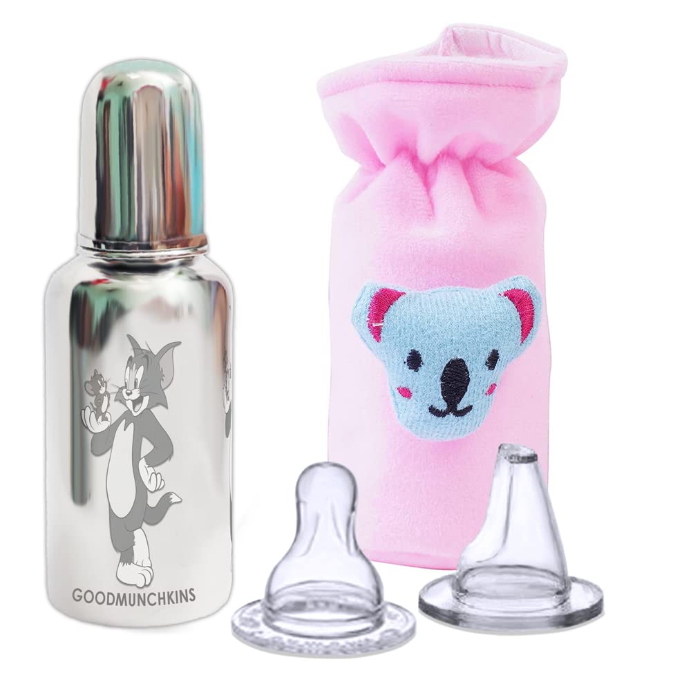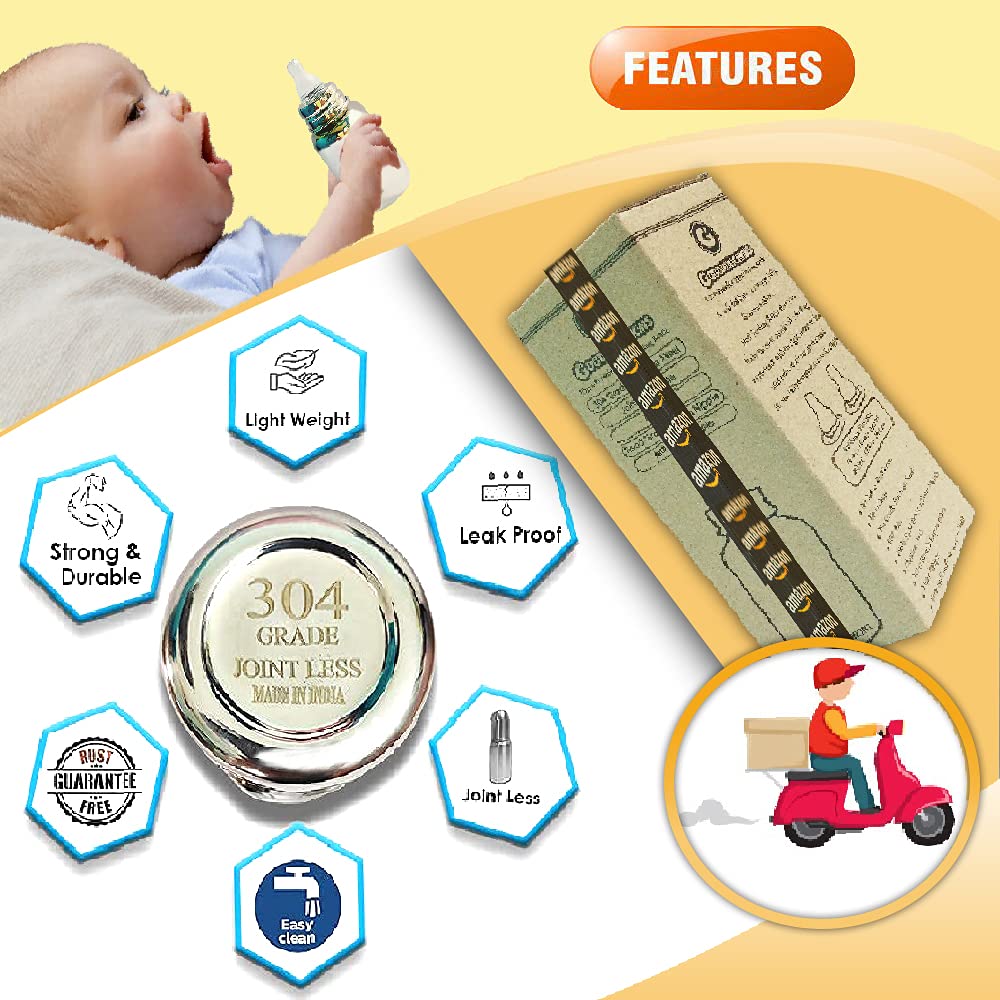 Goodmunchkins Stainless Steel Feeding Bottles opt for Newborn Baby/Infants/Toddlers. The size available 75150300ml Capacity. The Bottle is made of 304 Grade Steel without any welding Joints in the Bottle hence there is Rust Free Insides and Outside of the Bottle considering the Hygiene and Health of your Baby. The Bottle is made 100% with No Leakage on the neck side There are more quality checks Before Dispatching the Bottle to the Customer. Mirror finishing Bottle we can store Milk/Water/Juice/Soup. Lightweight so baby can hold it easily at the same time it very strong product. The Nipple is made of Food Grade Silicone. Extra soft medical-grade silicone spout provides an easy transition from bottle-feeding. Smooth Design with no sharp curves or edges keeping in mind Easy and Safe cleaning of the bottle. Easy to Carry Easy to Handle and Easy to Clean. No smell. No mess. The bottle is of sleek design and is very convenient while handling. Reduces sterilization work. Only Silicon Nipple needs to be sterilized. The bottle can be washed with Soap and Water Made in India.