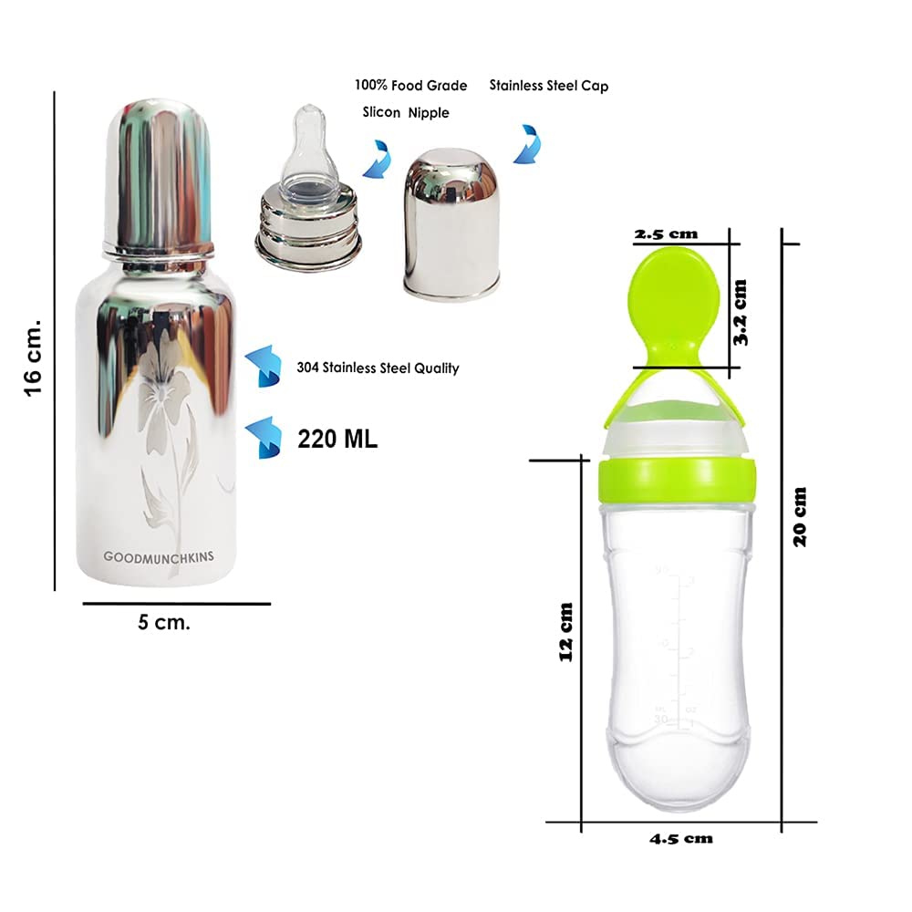 GOODMUNCHKINS Stainless Steel Baby Feeding Bottle - Silicon Food Feeder Silicone Spoon Feeder makes baby feeding easy for Parents. Ideal for 6 months and up babies this all-in-one feeder makes it a lot quicker and easier to feed a fussy baby. Baby Spoon Feeder has a stand-up design for convenience and hygiene.The Baby Feeder spoon and bottle are made of food-grade silicone Soft enough to touch babies' mouth. Clean the Silicone Spoon Feeder before use all parts can be sterilized or boiled in water for 3 to 5 minutes. A convenient way to feed your baby first pureed foods and cereals and help make feeding time more easier and less messy. Gently squeeze the Spoon Feeding Bottle until the desired amount of food collects onto the spoon to feed the baby.
