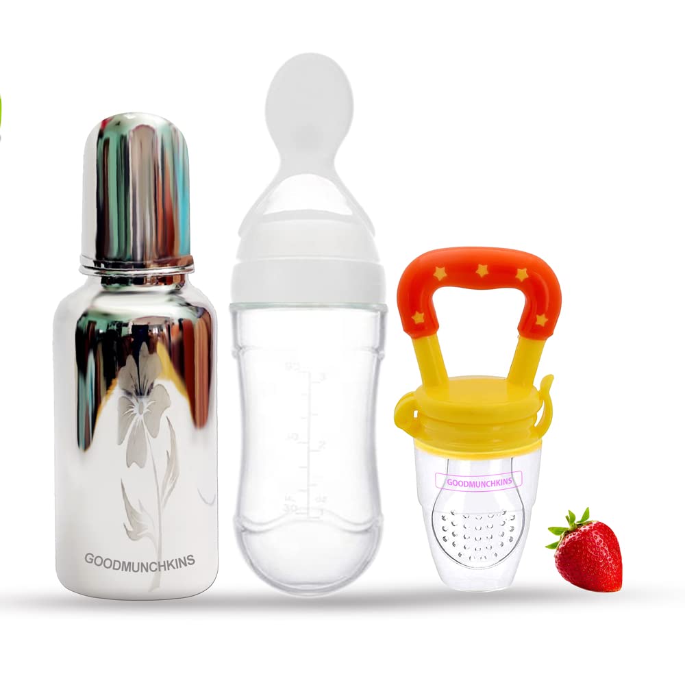 GOODMUNCHKINS Stainless Steel Baby Feeding Bottle - Silicon Food Feeder Silicone Spoon Feeder makes baby feeding easy for Parents. Ideal for 6 months and up babies this all-in-one feeder makes it a lot quicker and easier to feed a fussy baby. Baby Spoon Feeder has a stand-up design for convenience and hygiene.The Baby Feeder spoon and bottle are made of food-grade silicone Soft enough to touch babies' mouth. Clean the Silicone Spoon Feeder before use all parts can be sterilized or boiled in water for 3 to 5 minutes. A convenient way to feed your baby first pureed foods and cereals and help make feeding time more easier and less messy. Gently squeeze the Spoon Feeding Bottle until the desired amount of food collects onto the spoon to feed the baby.