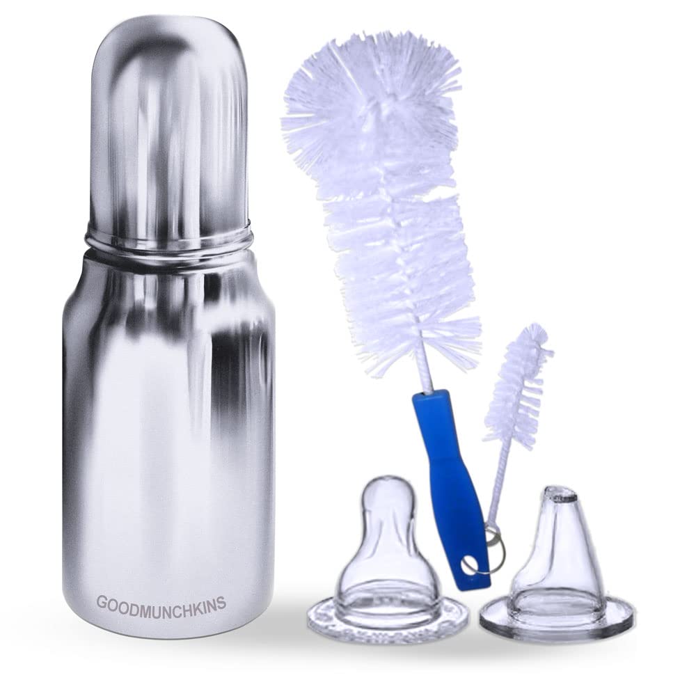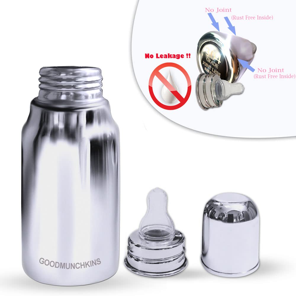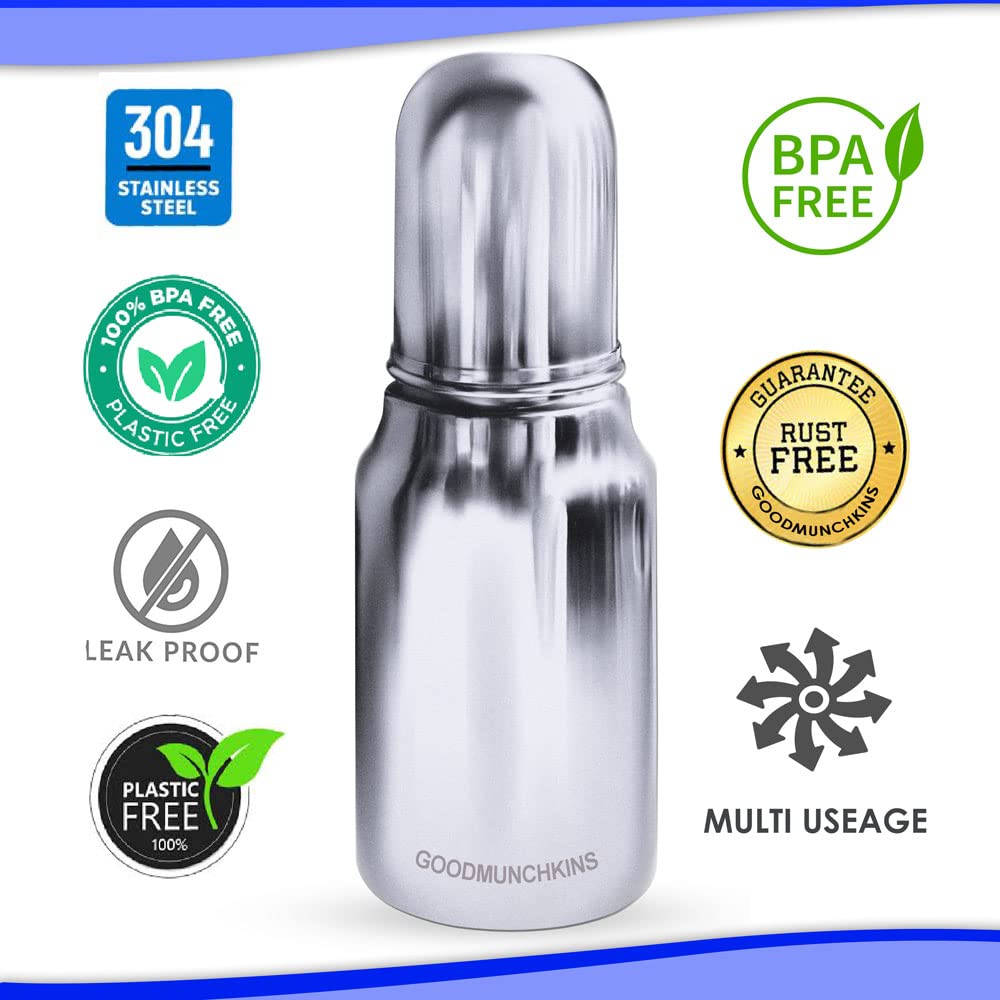 GOODMUNCHKINS Stainless Steel New-born Baby Feeding Bottle with Anti Colic Silicone Nipple with Nylon Bristle Bottle Cleaning Brush. We have two sizes in delux model i.e. 220ml 250ml Premium Mirror finishing in which we can store Milk/Water/Juice/Soup. Easy to hold for your Baby. Superior Lightweight Quality 304 Food Grade Stainless Steel Rust Free Product considering Health and Hygiene of your Baby The Nipple of the Bottle is made of Food Grade Silicon material. Spill-Proof Screw Type Nipple Cap and Push type outer lid makes the bottle completely leak-proof. Extra soft medical-grade silicone spout provides an easy transition from bottle-feeding. Free of - Biphenyl-A (BPA) phthalates nitrosamines lead PVC PET and biologically harmful chemicals. Free of BPA lead PVC nitrosamines phthalates PET and biologically harmful chemicals. Easy to Carry Easy to Handle and Easy to Clean. No smell. No mess. Smooth Design with no sharp curves or edges keeping in mind Easy and Safe cleaning of the bottle. The bottle is of sleek design and is very convenient while handling. Reduces sterilization work. Only Silicon Nipple needs to be sterilized. The bottle can be washed with soap and water ready to use again. A GOODMUNCHKINS Made in India Product
