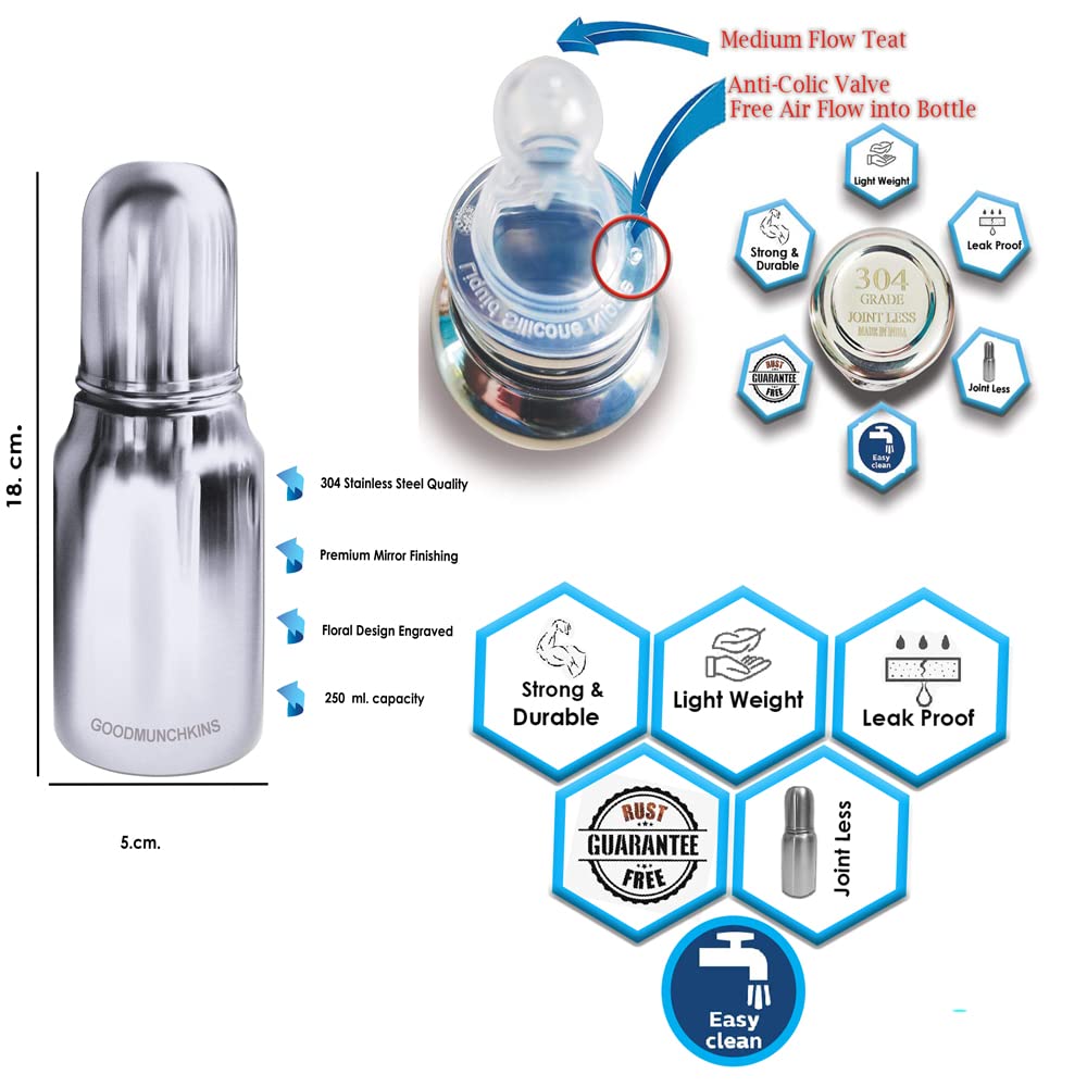 GOODMUNCHKINS Stainless Steel New-born Baby Feeding Bottle with Anti Colic Silicone Nipple with Nylon Bristle Bottle Cleaning Brush. We have two sizes in delux model i.e. 220ml 250ml Premium Mirror finishing in which we can store Milk/Water/Juice/Soup. Easy to hold for your Baby. Superior Lightweight Quality 304 Food Grade Stainless Steel Rust Free Product considering Health and Hygiene of your Baby The Nipple of the Bottle is made of Food Grade Silicon material. Spill-Proof Screw Type Nipple Cap and Push type outer lid makes the bottle completely leak-proof. Extra soft medical-grade silicone spout provides an easy transition from bottle-feeding. Free of - Biphenyl-A (BPA) phthalates nitrosamines lead PVC PET and biologically harmful chemicals. Free of BPA lead PVC nitrosamines phthalates PET and biologically harmful chemicals. Easy to Carry Easy to Handle and Easy to Clean. No smell. No mess. Smooth Design with no sharp curves or edges keeping in mind Easy and Safe cleaning of the bottle. The bottle is of sleek design and is very convenient while handling. Reduces sterilization work. Only Silicon Nipple needs to be sterilized. The bottle can be washed with soap and water ready to use again. A GOODMUNCHKINS Made in India Product