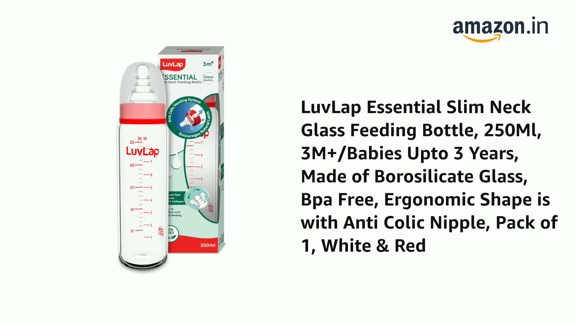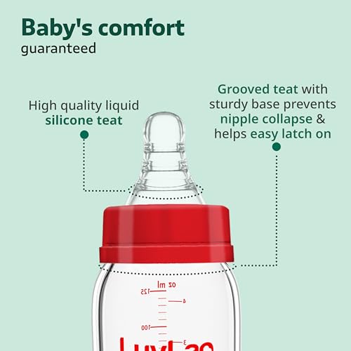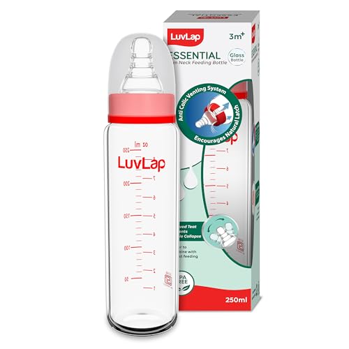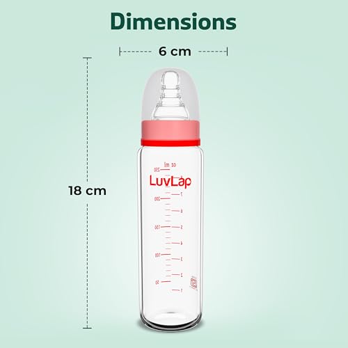 LuvLap Essential Slim Neck Glass Feeding Bottle Baby Milk bottle for New Born Infants & Toddlers Upto 3 Years is made of 100% Borosilicate glass. It is Non Toxic BPA Free Microwave Safe and easy to clean. The liquid silicone teat included is anti-colic