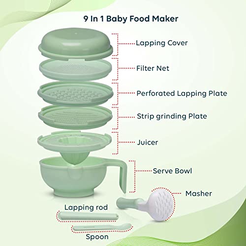 LuvLap 9 in 1 Baby Food Masher Mill Food Grinder Cum Processor with Multifunction Textured Mashing & Filtering Plates with Serving Bowl (Light Green)LuvLap 9 in 1 Baby Food Processor is Made of BOA Free PP material. It is nontoxic odor free and tasteless. It's different types of grinding modes include juicing filtering crushing and holding food. It could be used to grind fruits & vegetables meat and fishes into smooth paste. Different grinding filter has different use thegrinding filter with a lot of triangle bulges is for making blanketcarrot or cucumber the filter covered with small holes is used formaking fruit juice.It is easy to clean. Just rinse it with running water & let it dryLuvLap 4 Stage Baby Oral Care Set for infant baby Toddler & Kids' primary teeth & gums Infant Gum Massager 2 Toddler brushes One Training toothbrush BPA Free New Born to 60monthsLuvLap 4 stage Oral Care set promotes the early development of good dental hygiene. The soft material and bristles are designed to keep baby teething gums & teeth gentle & clean. The result of this special attention to detail is a product you and your child can use with ease.
