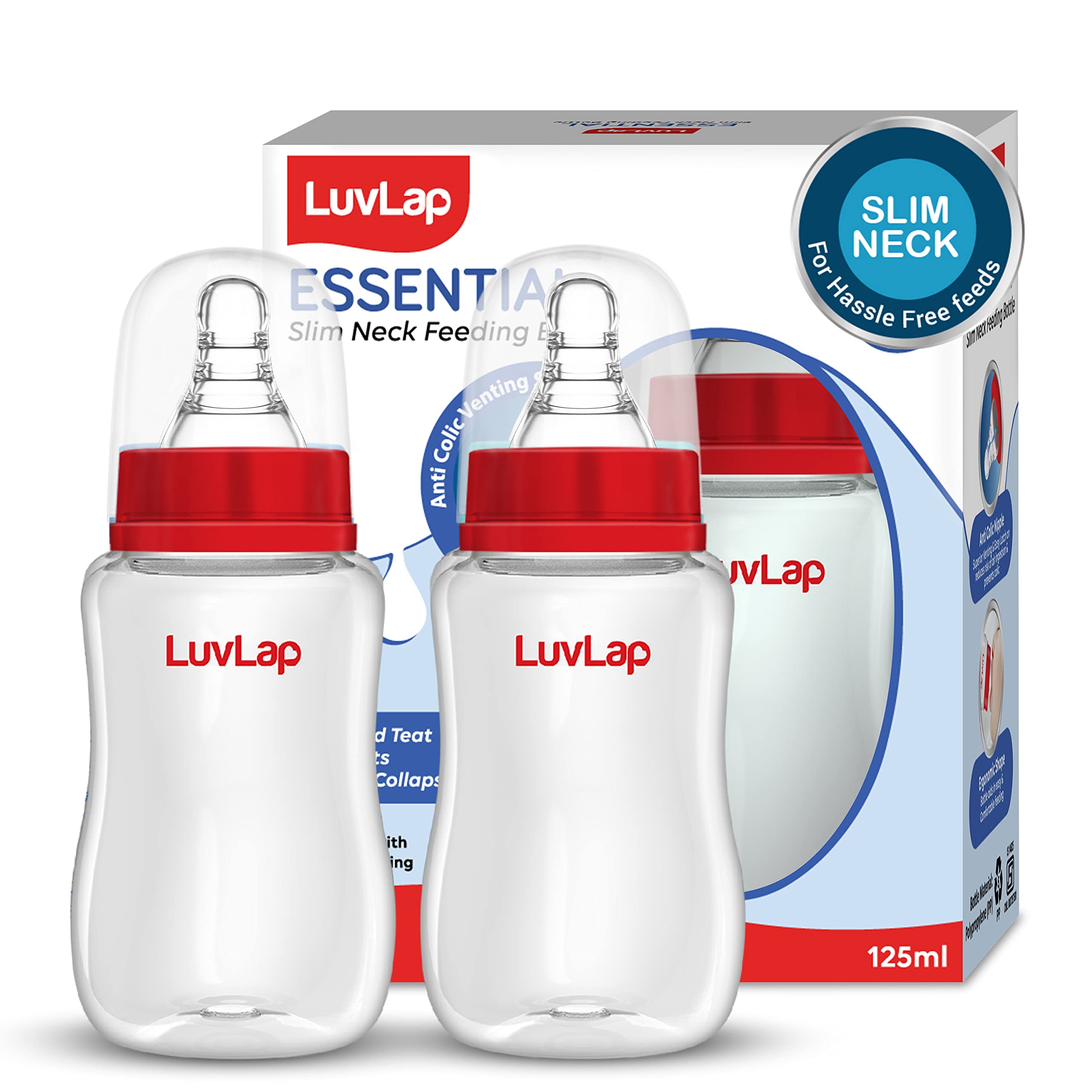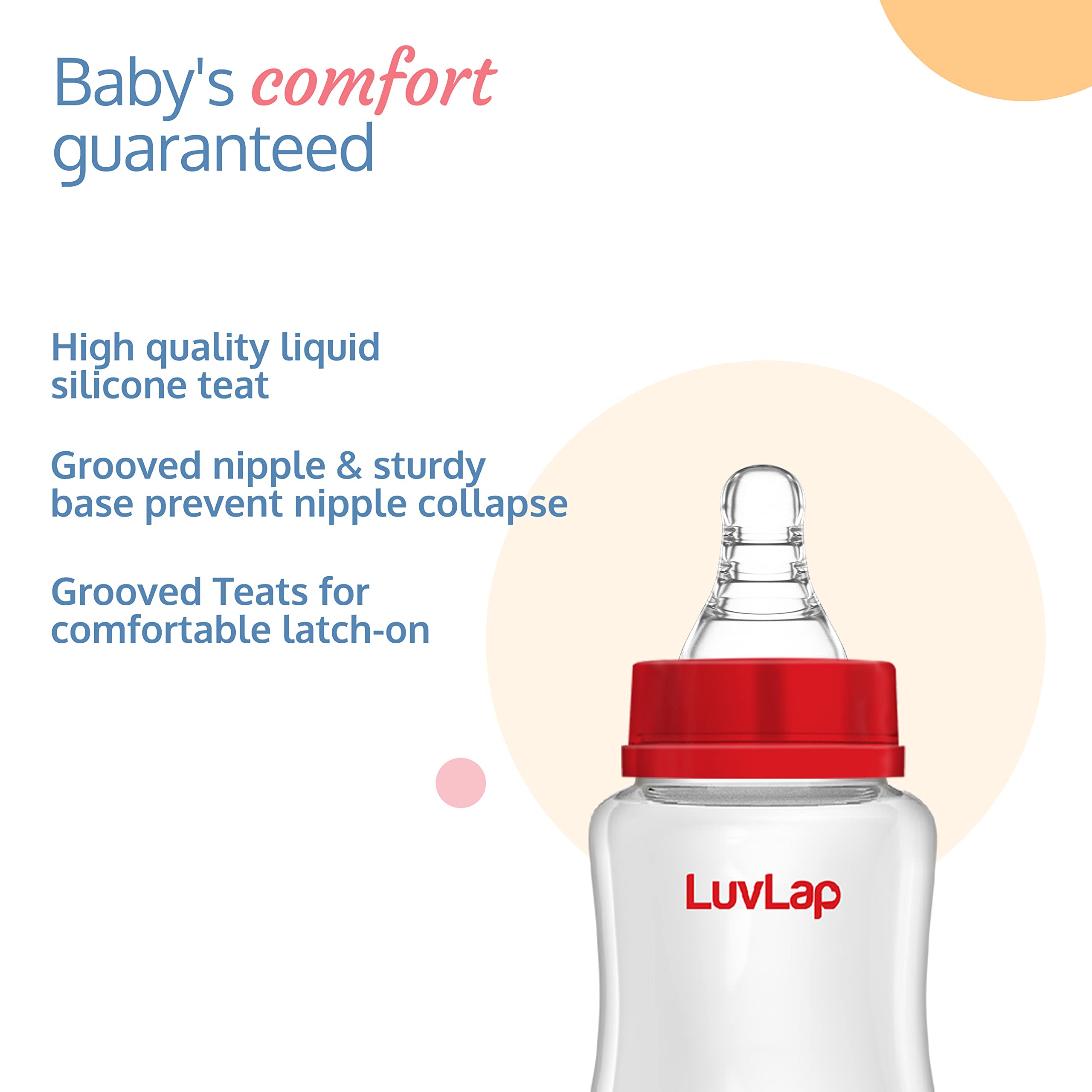 LuvLap Essential Feeding Bottles are ergonomically designed to be easily held while feeding the baby. All LuvLap bottles are 100% BPA free and fully sterilizable. The teats are 100% Liquid Silicone and have an anti-colic valve that vents air into the bottle preventing any air from entering the baby's tummy. The teat has spiral grooves at the tip which encourage peristaltic suckling and help the baby get a comfortable latch. The grooved teats and superior silicone quality ensure no nipple collapse helping in an uninterrupted feed. With the LuvLap Essential Feeding Bottles at your side your baby's feed will always be a comfortable one