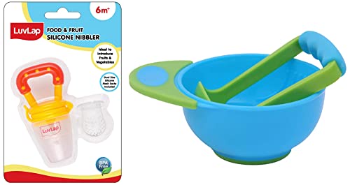 LuvLap Baby Food Grinding Cum Feeding Bowl Portable Baby Food Masher & Serving Bowl for Baby weaning Food Preparation (Green & Blue)LuvLap LuvLap Baby Food Grinding cum Feeding Bowl is Made of BPA Free PP material. It is nontoxic odor free and tasteless. It can be used to grind fruits & vegetables meat and fishes into smooth paste and pureed food. It is easy to clean. Just rinse it with running water & let it dryLuvLap Silicone Food/Fruit Nibbler with Extra Mesh Soft Pacifier/Feeder Teether for Infant Baby Infant Joystar Yellow BPA FreeFruit nibbler and teething toy to provide gentle relief to gums. Serves dual purpose of feeding fruit and vegetables to babies and can also be used as a teether. Can be filled with chilled fruits/vegetables to provide added relief. Made with bpa free food grade plastic and soft silicone it comes in attractive handle designs to EN gage the baby and is easy to hold and nibble upon.