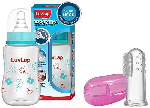 LuvLap Baby Finger Toothbrush with caseMade from Non Toxic Liquid Silicone. Gently cleans your baby's teeth and gum. Provides relief to the child's tender gums during teething. Includes case for storage and to maintain hygiene.Luvlap Anti-Colic Slim Wild Flowers BPA-free Regular Neck Baby Feeding Bottle 125ml GreenLuvLap Essential Feeding Bottles are ergonomically designed to be easily held while feeding the baby. All LuvLap bottles are 100% BPA free and fully sterilizable. The teats are 100% Liquid Silicone and have an anti-colic valve that vents air into the bottle preventing any air from entering the baby?s tummy. The teat has spiral grooves at the tip which encourage peristaltic suckling and help the baby get a comfortable latch. The grooved teats and superior silicone quality ensure no nipple collapse helping in an uninterrupted feed. With the LuvLap Essential Feeding Bottles at your side your baby?s feed will always be a comfortable one