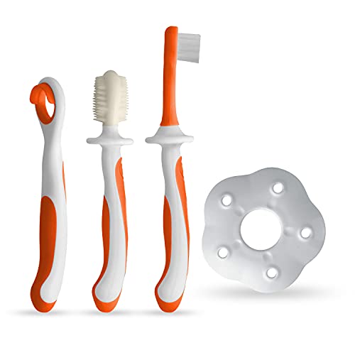 LuvLap Baby Training Toothbrush Set 3 pcs (White/Orange) & Anti-Colic Slim Wild Flowers BPA-Free Regular Neck Baby Feeding Bottle 125ml Green