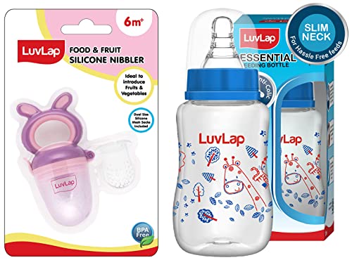 Luvlap Bunny Food & Fruit Nibbler & Anti-Colic Slim Regular Neck Essential BPA-Free Baby Feeding Bottle, 125Ml, Blue