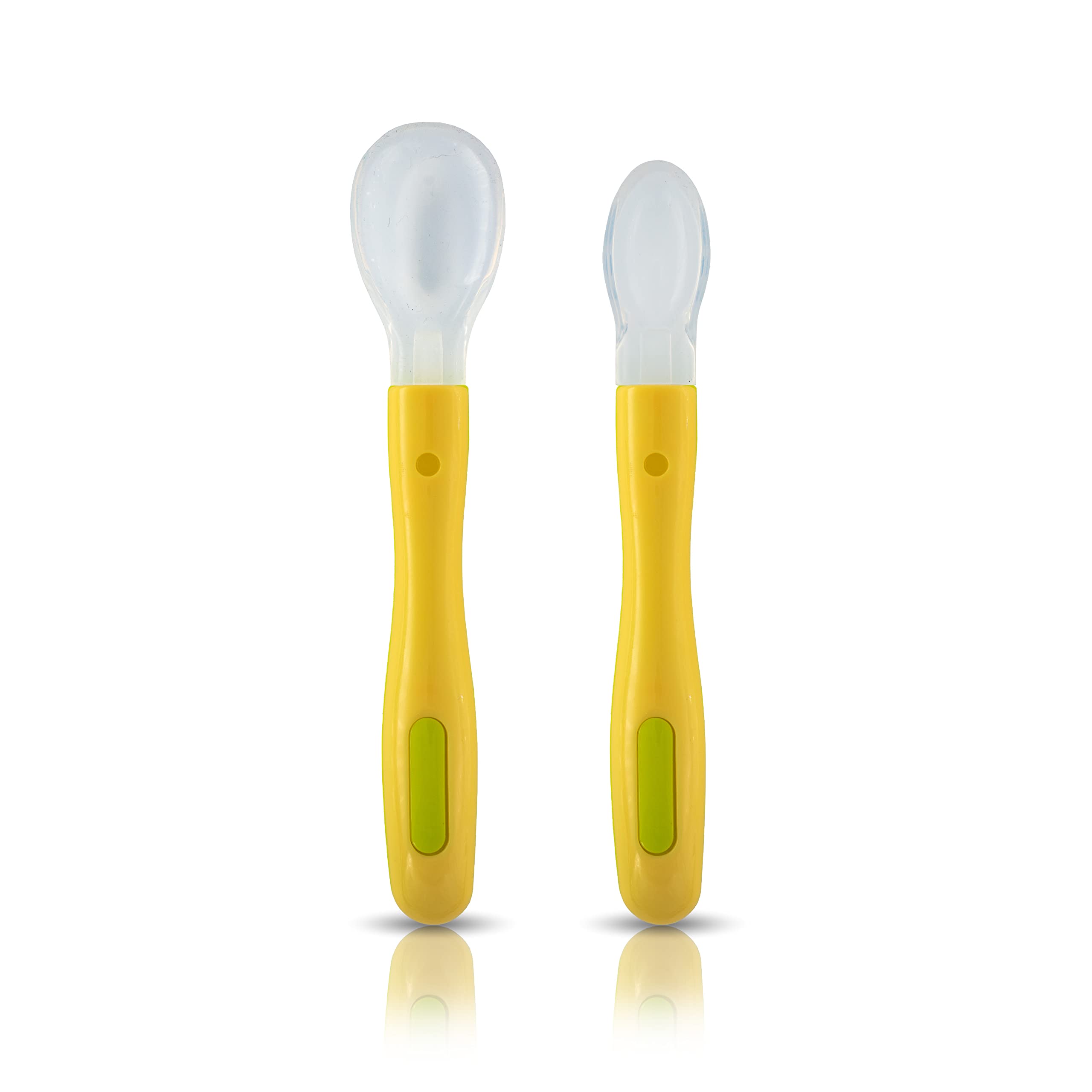 I am writing this review after using one week.. as you can see the heat resistant part blue turn white when the food or water served as hot.. later afte one week it is turning yellowish on the top..But overall the Product is worth to buy, simple to hold, soft and flexible for 6 months above babies to chew or bite since it's silcon only on the top. My daughter use to bite the silver spoon.. but now she enjoys this spoon and she eats much better..Forgot the heat resistant part bcoz as a mother you know what is the temp the food to be served you can even use your finger to test the hot food.Loved it..