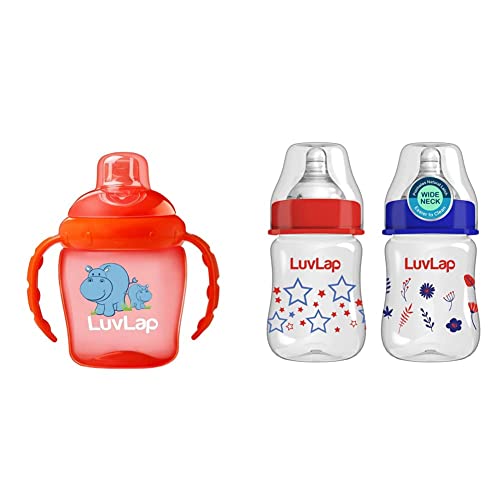 LuvLap Hippo Sipper / Sippy Cup 225ml Anti-Spill Design with Soft Silicone Spout 6m+ (Orange)Luvlap hippo sipper with soft silicon spout is ideal for your 6 months plus baby. The soft silicon spout helps in overall oral development of your child. It has an in-built valve which makes it non- spill and leak proof preventing any unwanted spilling and mess.Luvlap Wide Neck Natura Flo Baby Feeding Bottle 150ml Pack of 2 Floral & StarsLuvLap Natura Flow Feeding Bottles are ergonomically designed to be easily held while feeding the baby. All LuvLap bottles are 100% BPA free and fully sterilizable. The teats are 100% Liquid Silicone and have an anti-colic valve that vents air into the bottle preventing any air from entering the babys tummy. The teat has grooves at the tip which encourage peristaltic suckling while the wide base helps the baby get a natural latch similar to that on the mothers breast. This helps easy transition between breastfeeding & bottle feeding. The grooved teats and superior silicone quality ensure no nipple collapse helping in an uninterrupted feed.