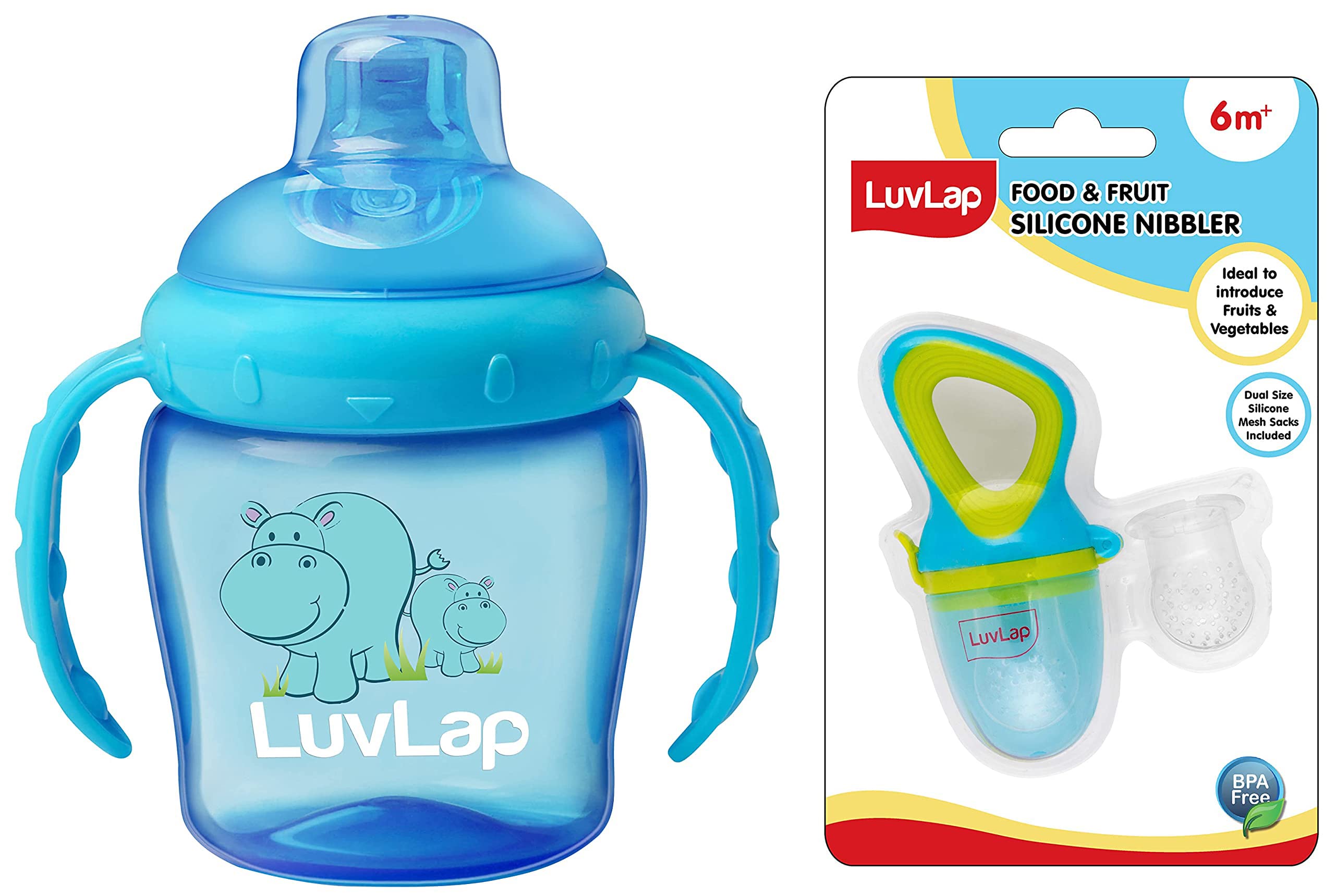 LuvLap Hippo Sipper BlueLuvLap Hippo Spout Sippers are meant for babies' of 6 month + age. The sipper comes with an intelligent spout with touch flo valve which ensures zero spillage. The sipper is made up of BPA free plastic.LuvLap Silicone Food/Fruit Nibbler with Extra Mesh Soft Pacifier/Feeder Teether for Infant Baby Infant Elegant Blue BPA FreeFruit nibbler and teething toy to provide gentle relief to gums. Serves dual purpose of feeding fruit and vegetables to babies and can also be used as a teether. Can be filled with chilled fruits/vegetables to provide added relief. Made with bpa free food grade plastic and soft silicone it comes in attractive handle designs to EN gage the baby and is easy to hold and nibble upon.