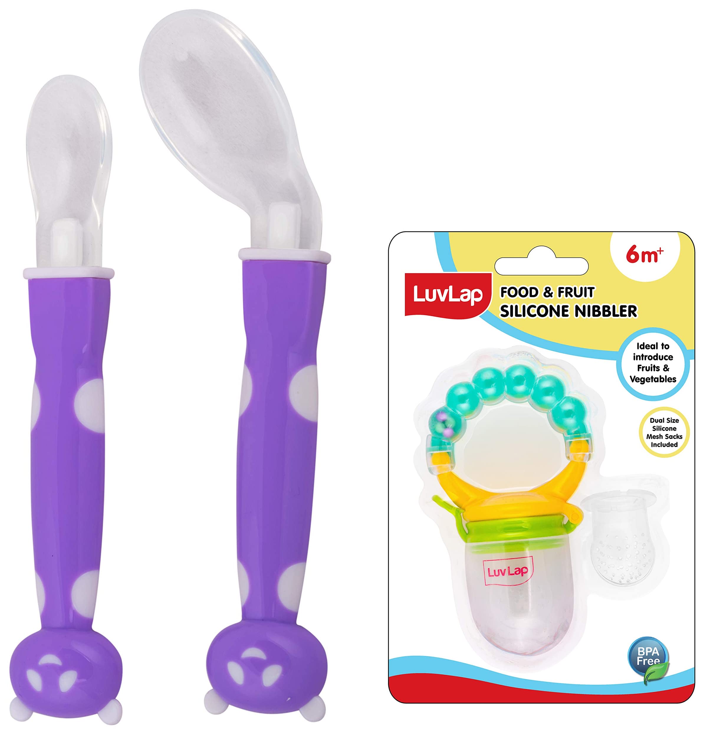 Luvlap Joy Star Baby Self Feeding Spoon Set Soft Silicone Tip BPA Free 2 pcs Magenta / WhiteLifes little stories bloom with coming of the little one in your life. It completes your life with many joys of parenthood. For baby its the next best thing to being in your arms. Entertain your little one and give him or her a personal resting place. Luvlaps high chairs cots walkers and other indoor products will have the whole household floored by babys happy smiles and chuckles. At Luvlap we endeavour to weave the little stories into our products with an emphasis on child safety and enrichment of features. So that your little one gets the comfort thats next only to the warmth of your lap. Conceived with care and made using the latest marvels of science all Luvlap products undergo multiple quality checks before they are dispatched to the stores. The products are available at all leading baby gear and online stores and conform to the european standards.LuvLap Pearly Food & Fruit NibblerFruit nibbler and teething toy to provide gentle relief to gums. Serves dual purpose of feeding fruit and vegetables to babies and can also be used as a teether. Can be filled with chilled fruits/vegetables to provide added relief. Made with bpa free food grade plastic and soft silicone it comes in attractive handle designs to EN gage the baby and is easy to hold and nibble upon