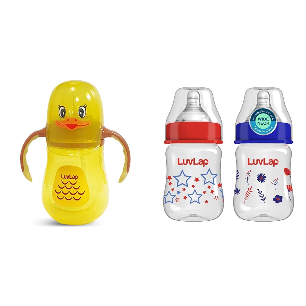 LuvLap Naughty Duck Sipper / Sippy Cup 280ml Anti-Spill Design with Soft Silicone Straw 12m+ (Yellow)LuvLap naughty duck straw sipper comes with a spill proof weighted straw. Weighted straw allows child to drink at any angle easily. Ergonomically designed easy grip handles are specially designed as per requirement of small baby hands.Luvlap Wide Neck Natura Flo Baby Feeding Bottle 150ml Pack of 2 Floral & StarsLuvLap Natura Flow Feeding Bottles are ergonomically designed to be easily held while feeding the baby. All LuvLap bottles are 100% BPA free and fully sterilizable. The teats are 100% Liquid Silicone and have an anti-colic valve that vents air into the bottle preventing any air from entering the babys tummy. The teat has grooves at the tip which encourage peristaltic suckling while the wide base helps the baby get a natural latch similar to that on the mothers breast. This helps easy transition between breastfeeding & bottle feeding. The grooved teats and superior silicone quality ensure no nipple collapse helping in an uninterrupted feed.