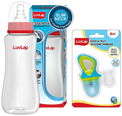 LuvLap Silicone Food/Fruit Nibbler with Extra Mesh Soft Pacifier/Feeder Teether for Infant Baby Infant Elegant Blue BPA FreeFruit nibbler and teething toy to provide gentle relief to gums. Serves dual purpose of feeding fruit and vegetables to babies and can also be used as a teether. Can be filled with chilled fruits/vegetables to provide added relief. Made with bpa free food grade plastic and soft silicone it comes in attractive handle designs to EN gage the baby and is easy to hold and nibble upon.LuvLap Anti-Colic Slim/Regular Neck Essential Baby Feeding Bottle 250ml New Born/Infants/Toddler Upto 3 Years BPA Free White and Red Pack of 1LuvLap Essential Feeding Bottles are ergonomically designed to be easily held while feeding the baby. All LuvLap bottles are 100% BPA free and fully sterilizable. The teats are 100% Liquid Silicone and have an anti-colic valve that vents air into the bottle preventing any air from entering the babys tummy. The teat has spiral grooves at the tip which encourage peristaltic suckling and help the baby get a comfortable latch. The grooved teats and superior silicone quality ensure no nipple collapse helping in an uninterrupted feed. With the LuvLap Essential Feeding Bottles at your side your babys feed will always be a comfortable one