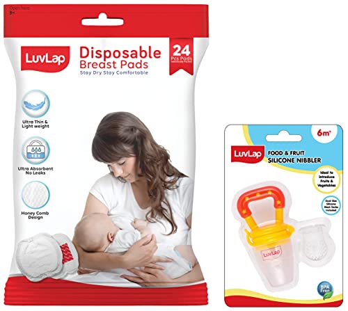 LuvLap Silicone Food/Fruit Nibbler with Extra Mesh Soft Pacifier/Feeder Teether for Infant Baby Infant Joystar Yellow BPA FreeFruit nibbler and teething toy to provide gentle relief to gums. Serves dual purpose of feeding fruit and vegetables to babies and can also be used as a teether. Can be filled with chilled fruits/vegetables to provide added relief. Made with bpa free food grade plastic and soft silicone it comes in attractive handle designs to EN gage the baby and is easy to hold and nibble upon.LuvLap Ultra Thin Honeycomb Nursing Breast Pads 24pcs Disposable High Absorbent Discreet FitLuvlap breast pads 24's pack super absorbent pad quickly absorbs excessive breast milk and locks in moisture for optimum dryness and comfort.