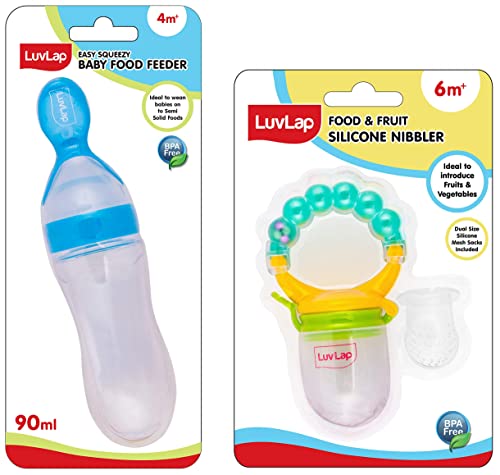 LuvLap Silicone Food/Fruit Nibbler with Extra Mesh Soft Pacifier/Feeder Teether for Infant Baby Infant Pearly Green BPA FreeFruit nibbler and teething toy to provide gentle relief to gums. Serves dual purpose of feeding fruit and vegetables to babies and can also be used as a teether. Can be filled with chilled fruits/vegetables to provide added relief. Made with bpa free food grade plastic and soft silicone it comes in attractive handle designs to EN gage the baby and is easy to hold and nibble upon.LuvLap Feeding Spoon with Squeezy food Grade Silicone Feeder bottle For Infant Baby 90ml BPA FreeBlueSoft Silicone food feeding bottle with spoon can be used to feed puries juice milk or water to babies. Helps in easy transition. Effortless one hand feeding. Dust cover and disk make it easy to keep and carry.