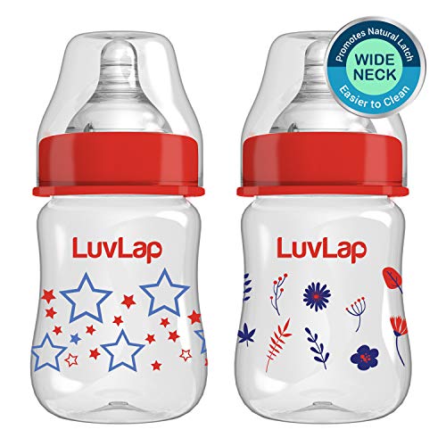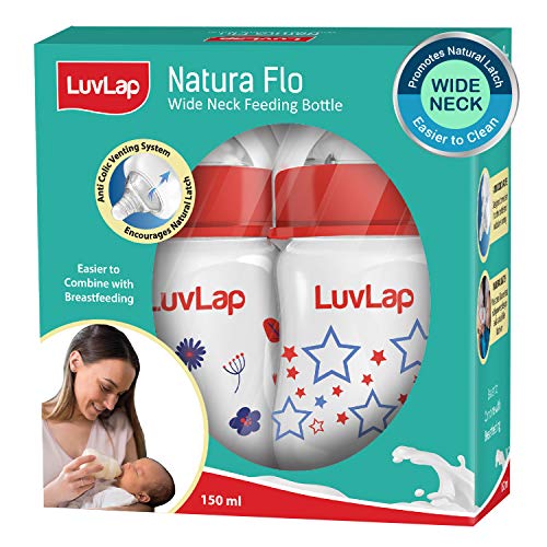 LuvLap Tiny Giffy Sipper / Sippy Cup 300ml Anti-Spill Design with Soft Silicone Straw 18m+ (Purple)Attractive sippers in various designs and colours. Made from non toxic BPA free plastic and soft silicone. Silicone straw helps in building oral strength. Ergonomically designed easy to hold and drink from.Luvlap Wide Neck Natura Flo Baby Feeding Bottle 150ml Pack of 2 Floral & StarsLuvLap Natura Flow Feeding Bottles are ergonomically designed to be easily held while feeding the baby. All LuvLap bottles are 100% BPA free and fully sterilizable. The teats are 100% Liquid Silicone and have an anti-colic valve that vents air into the bottle preventing any air from entering the babys tummy. The teat has grooves at the tip which encourage peristaltic suckling while the wide base helps the baby get a natural latch similar to that on the mothers breast. This helps easy transition between breastfeeding & bottle feeding. The grooved teats and superior silicone quality ensure no nipple collapse helping in an uninterrupted feed.