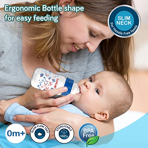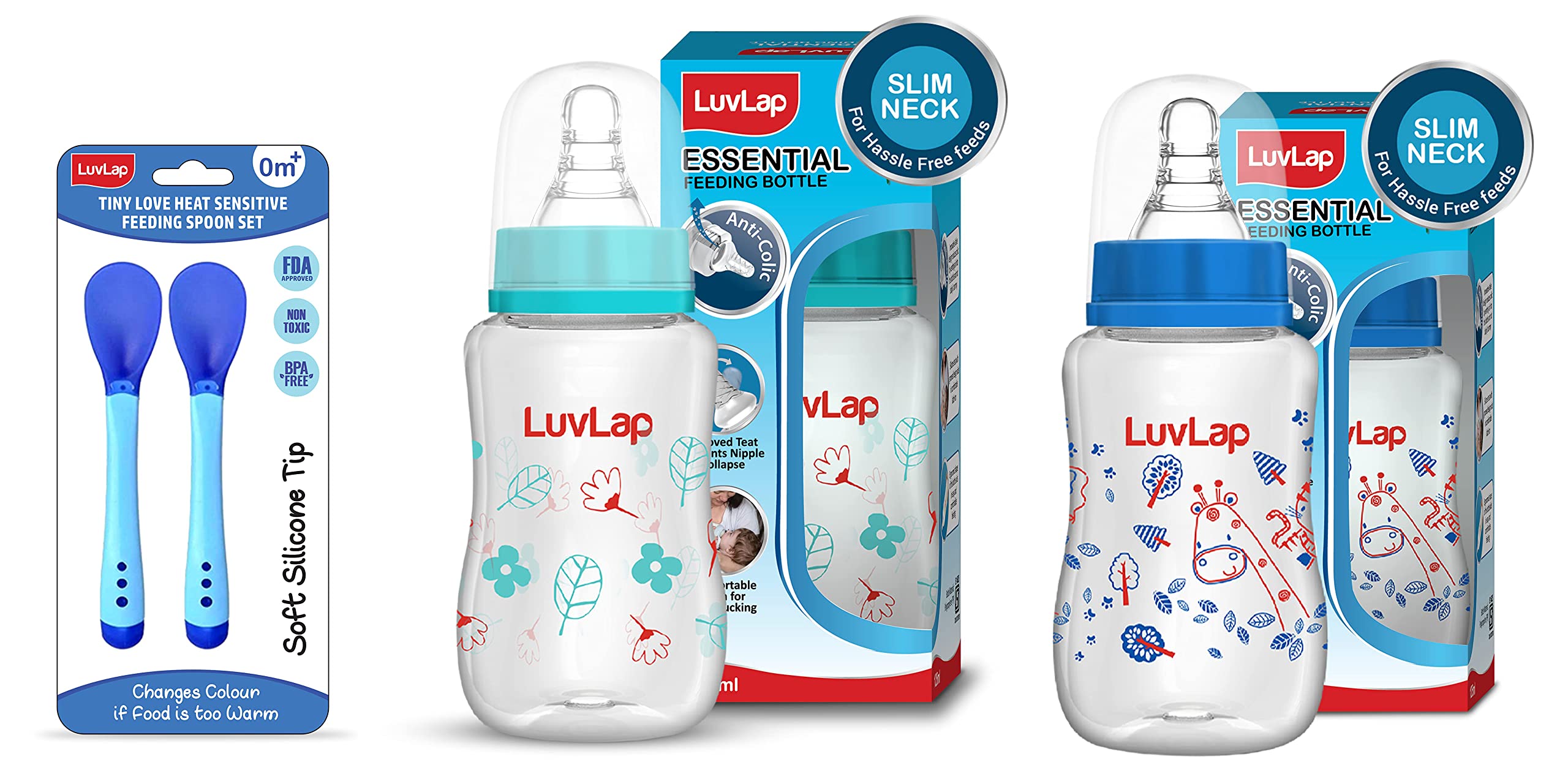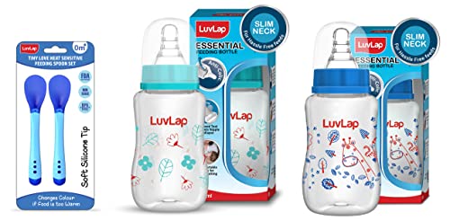 LuvLap Tiny Love Heat Sensitive Baby Feeding Spoons Set, 2 pcs, Blue & Anti-Colic Slim Wild Flowers, Regular Neck Baby Feeding Bottle, 125ml, Green & Anti-Colic Slim Baby Feeding Bottle, 125ml, Blue