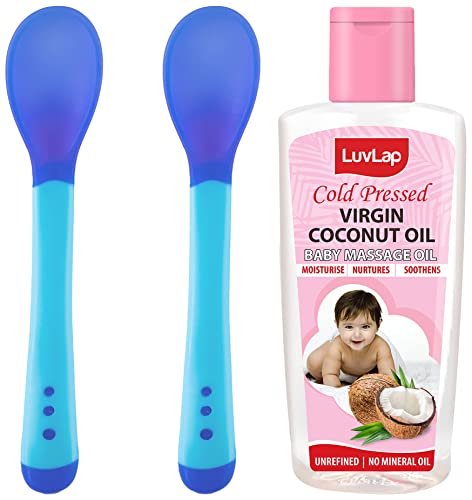 LuvLap Tiny Love Heat Sensitive Baby Feeding Spoons Set Food Grade PP Kids & Baby Spoon with Soft Silicone Tip Color changing BPA Free FDA Apporved 2 pcs BlueLifeÂs little stories bloom with coming of the little one in your life. It completes your life with many joys of parenthood. For baby itÂs the next best thing to being in your arms. Entertain your little one and give him or her a personal resting place. LuvlapÂs high chairs cots walkers and other indoor products will have the whole household floored by babyÂs happy smiles and chuckles. At Luvlap we endeavour to weave the little stories into our products with an emphasis on child safety and enrichment of features. So that your little one gets the comfort thatÂs next only to the warmth of your lap. Conceived with care and made using the latest marvels of science all Luvlap products undergo multiple quality checks before they are dispatched to the stores. The products are available at all leading baby gear and online stores and conform to the european standards.LuvLap Baby Hair & Skin Oil 100% Natural Cold Pressed Virgin Coconut Oil Baby Massage Oil Prevents Diaper Rash 100mlLuvLap Cold Press Virgin Coconut Oil is a specially crafted baby massage oil with many proven benefits for babies. Virgin coconut oil (vco) is extracted from fresh coconut milk and is 100 percent natural. It is unrefined unbleached and cold pressed. Unlike hot pressed coconut oils VCO contains fresh aroma of coconut oil and no bad odour. Its massage improves blood circulation nourishes muscles and bones. Regular massage with LuvLap Cold Press Virgin Coconut Oil also helps relieve colic improves baby's sleep pattern. It contains vitamin E which is good for healthy skin nourishes and strengthenes the hair and baby's scalp. Its a natural moisturizer for baby's skin keeping the skin soft and supple. It can also be used as a nappy rash cream and prevents any irritation from rashes. Good for cradle cap loosens the cradle cap flakes while nourishing the scalp.