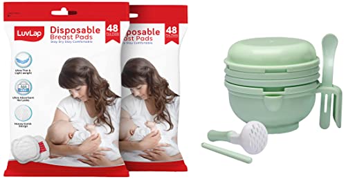 LuvLap Disposable Breast Pads - Ultra Thin and Super Absorbent - Pack of 96Luvlap breast pads 96's pack super absorbent pad quickly absorbs excessive breast milk and locks in moisture for optimum dryness and comfort. Breathable and Waterproof Protective Layer Film. It Provides a powerful protection to ensure the clothes are dry and breathe freely 3D Stretch Edge the 3D stretch edge close to the chest curve it provide a natural contour and perfect fit.LuvLap 9 in 1 Baby Food Masher Mill Food Grinder Cum Processor with Multifunction Textured Mashing & Filtering Plates with Serving Bowl (Light Green)LuvLap 9 in 1 Baby Food Processor is Made of BOA Free PP material. It is nontoxic odor free and tasteless. It's different types of grinding modes include juicing filtering crushing and holding food. It could be used to grind fruits & vegetables meat and fishes into smooth paste. Different grinding filter has different use thegrinding filter with a lot of triangle bulges is for making blanketcarrot or cucumber the filter covered with small holes is used formaking fruit juice.It is easy to clean. Just rinse it with running water & let it dry