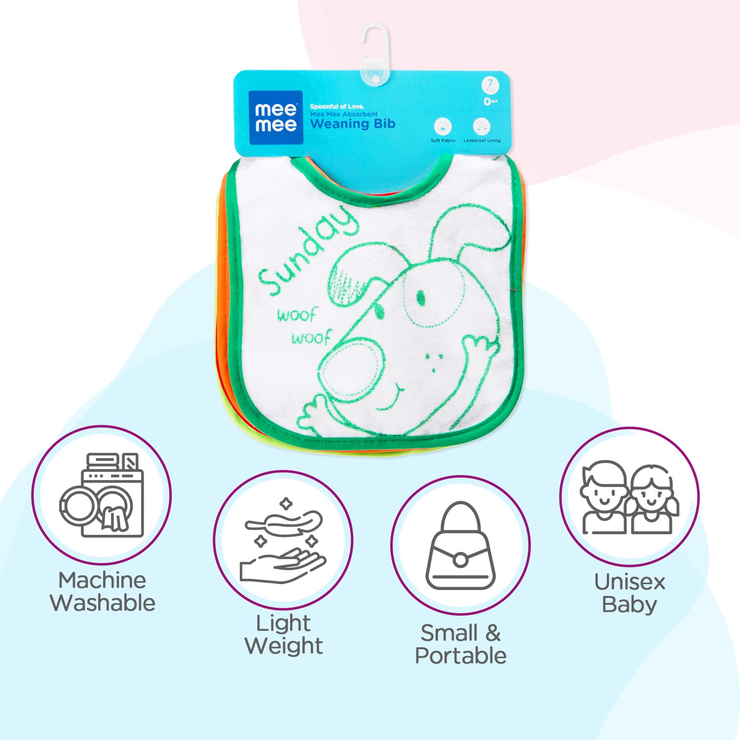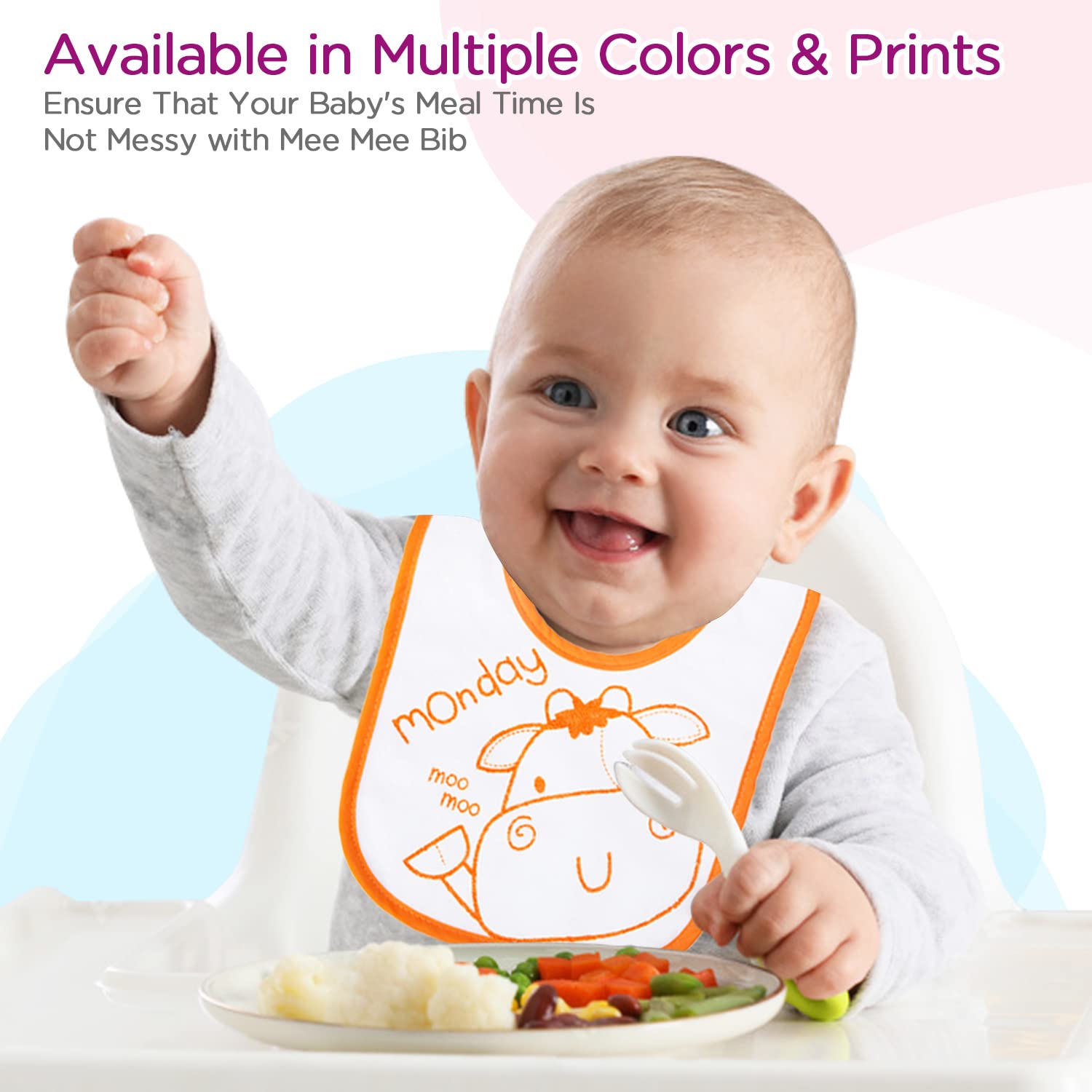 Mealtimes mean new tastes textures and sometimes a good amount of mess. Keep it fun and reduce cleaning up with mee mee weaning bibs. Perfect for keeping your baby dry and their clothes clean while they eat drink or drool. Made of soft and absorbent fabric these bibs are available in different colours and designs and are easy to put on and take off.